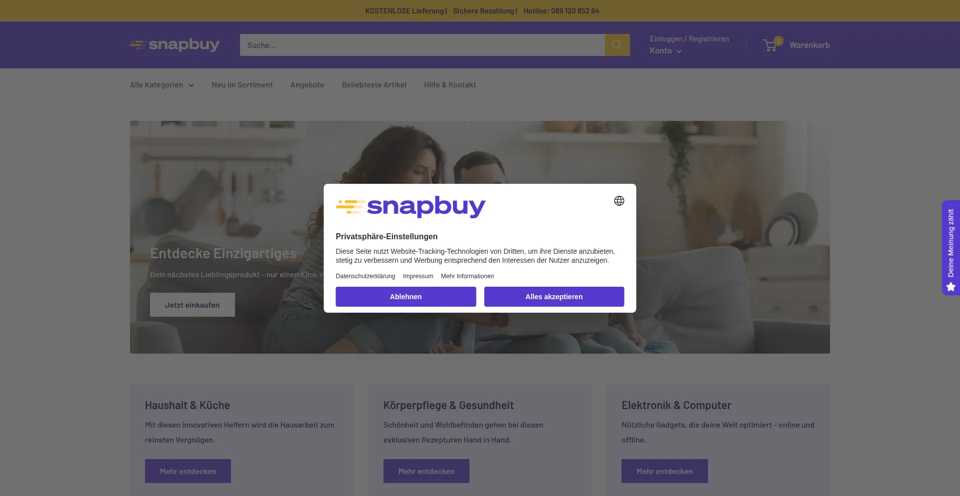 该网站实现数据收集表单,请求个人信息,包括姓名、电子邮件地址、电话号码或其他敏感详细信息。用户应验证 snapbuy.de 的合法性并在提交个人数据前查看隐私政策。
