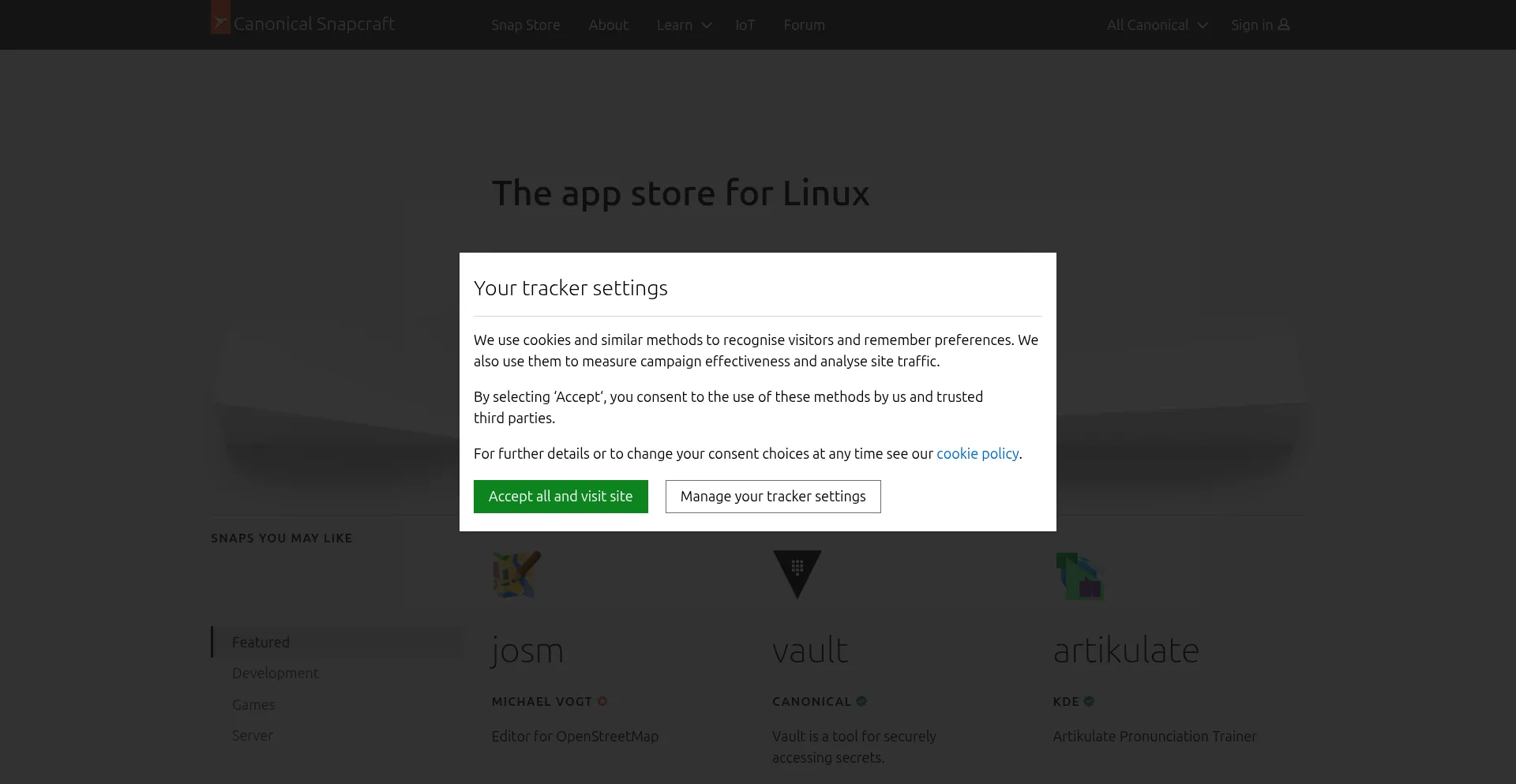 该网站实现符合GDPR或CCPA等隐私法规的cookie同意机制。这表明 snapcraft.io 遵守数据保护标准并为用户提供对个人数据收集实践的控制。