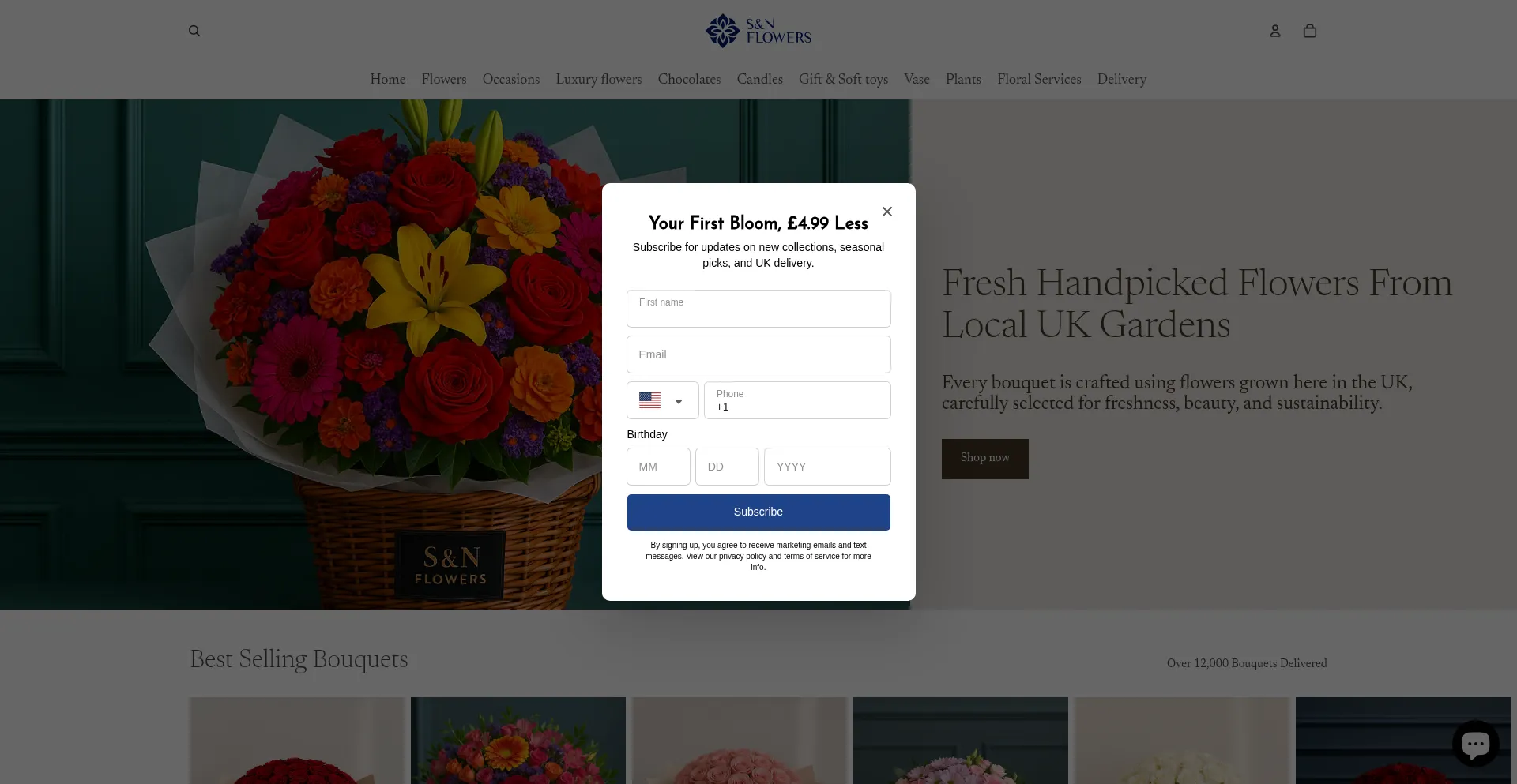 该网站实现数据收集表单,请求个人信息,包括姓名、电子邮件地址、电话号码或其他敏感详细信息。用户应验证 snflowers.co.uk 的合法性并在提交个人数据前查看隐私政策。