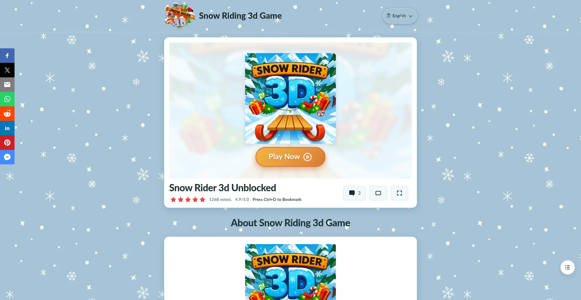 Play Snow Rider 3D Unblocked, the thrilling snow riding 3D game. Glide through snowy hills, dodge obstacles, and collect gifts for top scores!