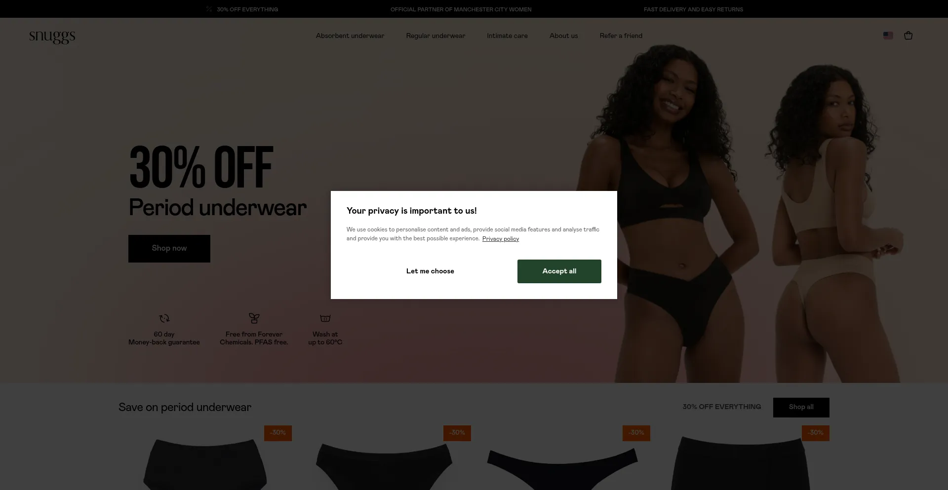 该网站实现符合GDPR或CCPA等隐私法规的cookie同意机制。这表明 snuggs.com 遵守数据保护标准并为用户提供对个人数据收集实践的控制。