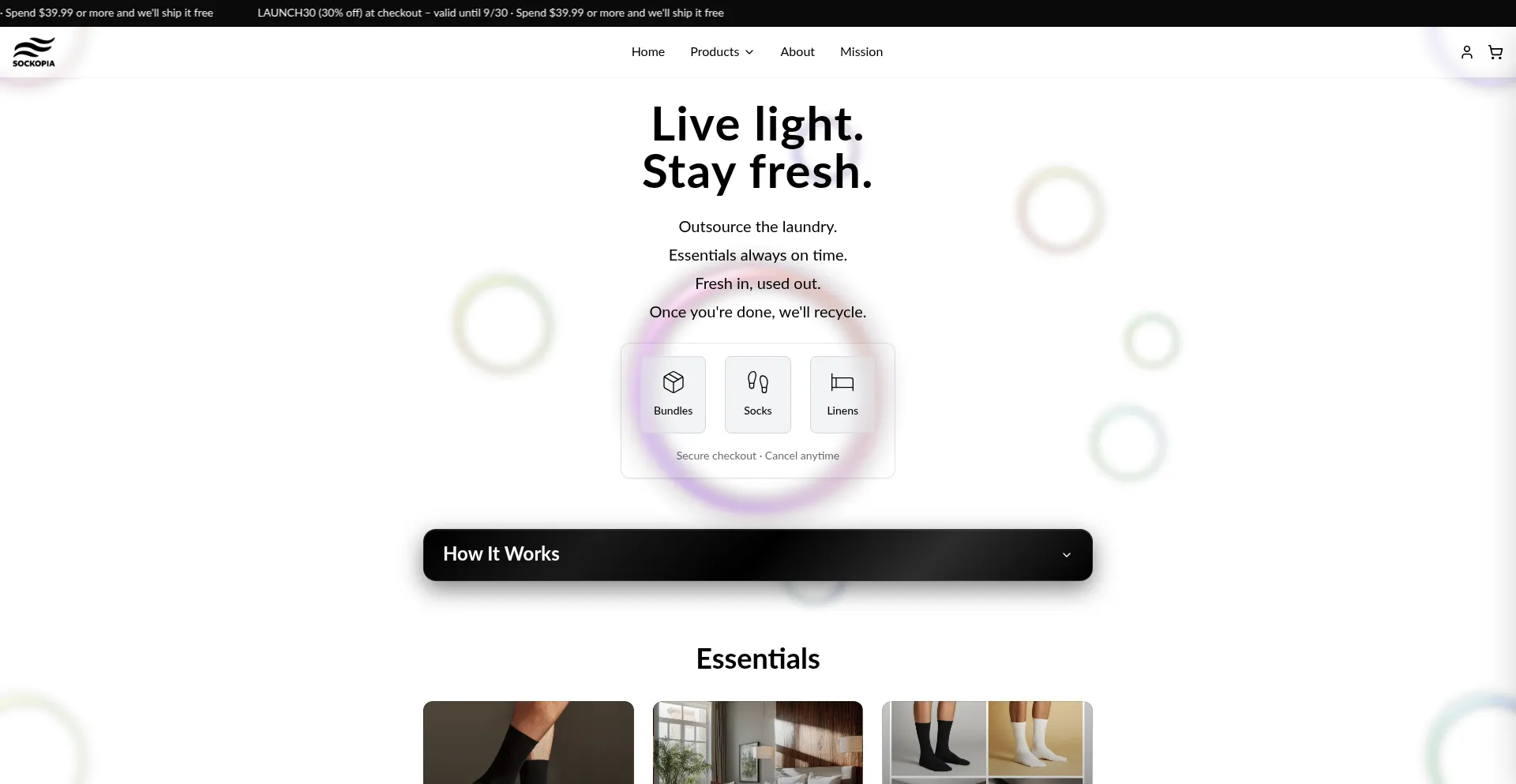 Live light. Stay fresh. Socks and bedding subscriptions that give you your time back. Always fresh, always on time. Recyclable when you're done.