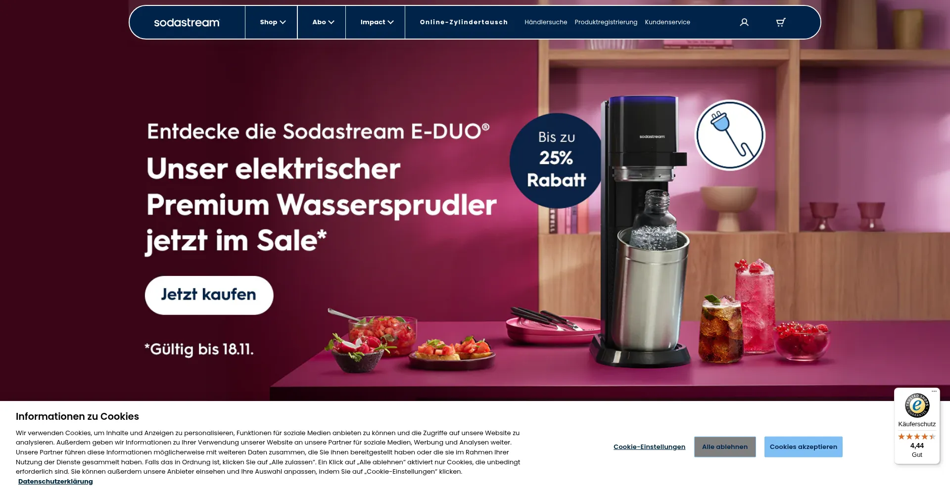 该网站实现符合GDPR或CCPA等隐私法规的cookie同意机制。这表明 sodastream.de 遵守数据保护标准并为用户提供对个人数据收集实践的控制。