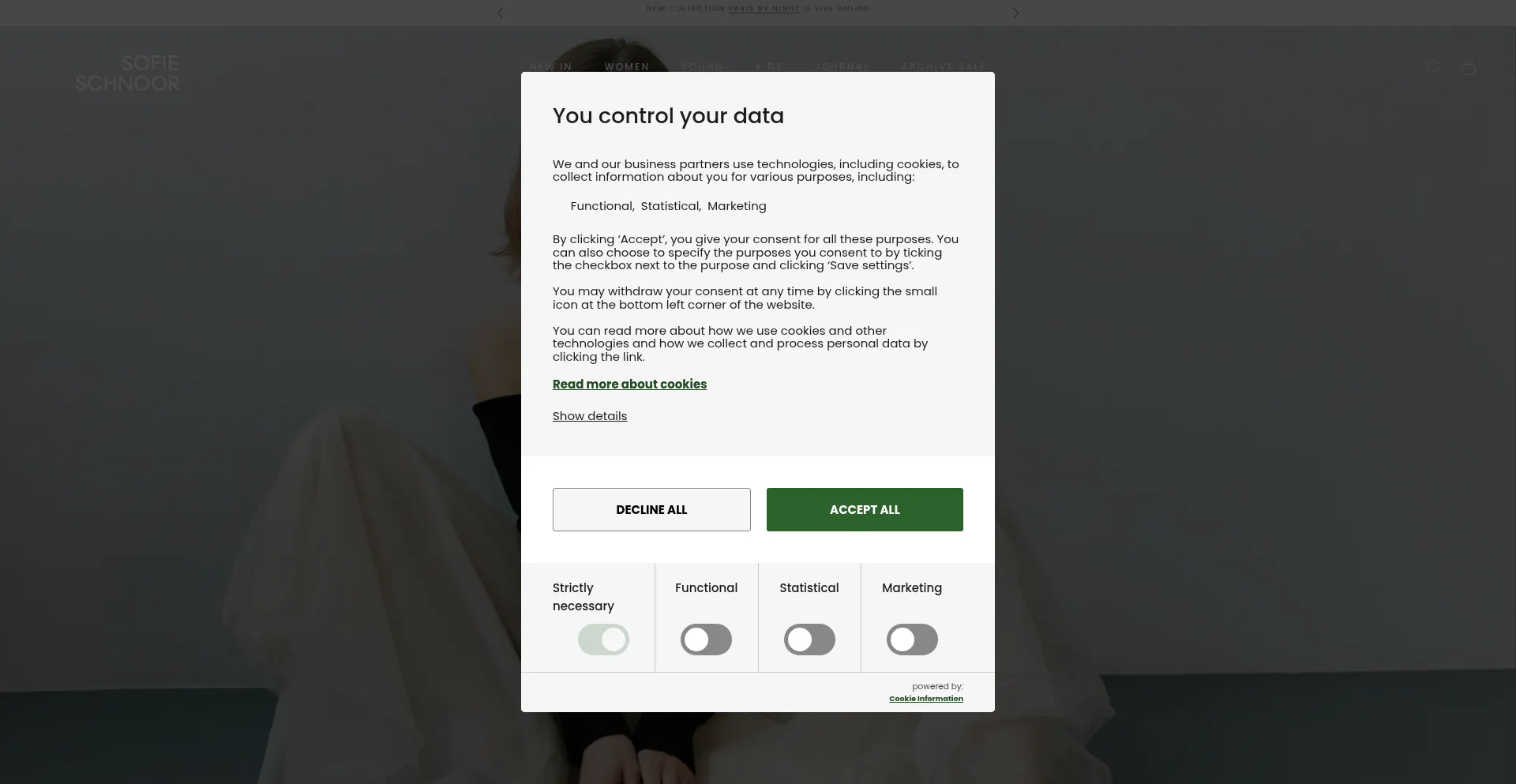 该网站实现符合GDPR或CCPA等隐私法规的cookie同意机制。这表明 sofieschnoor.com 遵守数据保护标准并为用户提供对个人数据收集实践的控制。
