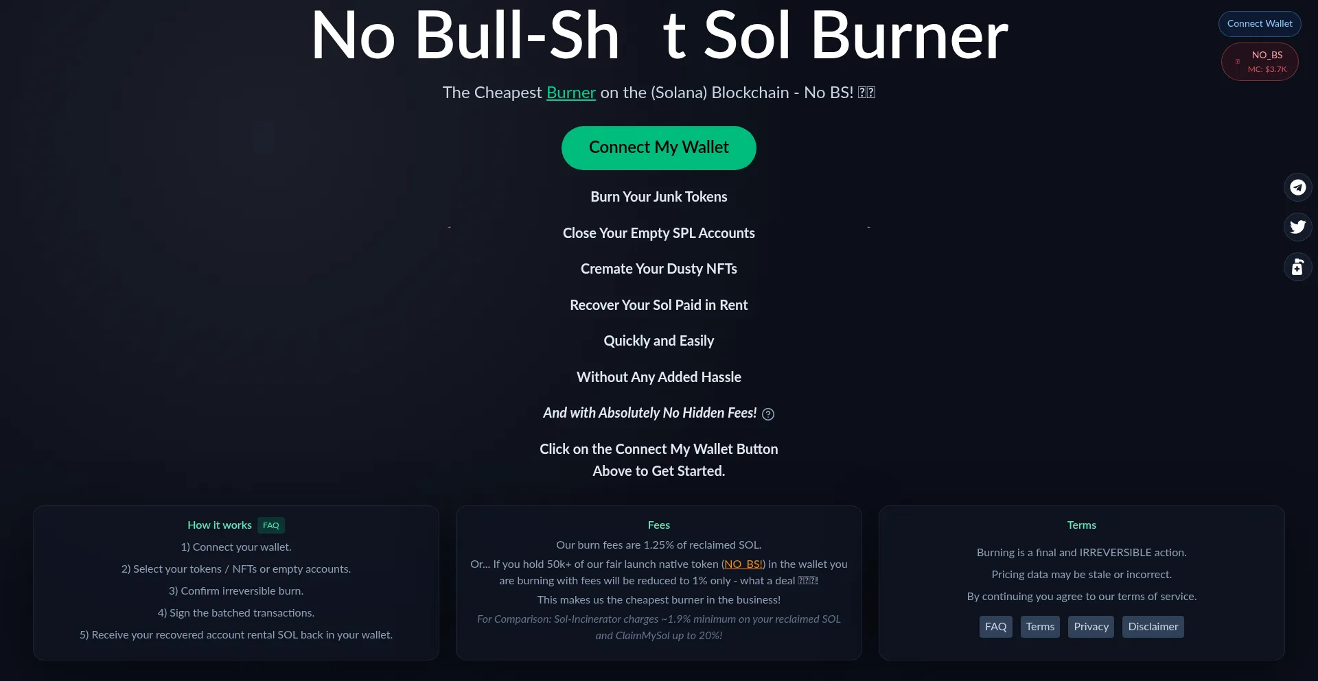 No BS Sol Burner - The simplest and cheapest Sol token burner of them all. Burn junk tokens, close empty SPL accounts, cremate dusty NFTs, and recover rent fees instantly.