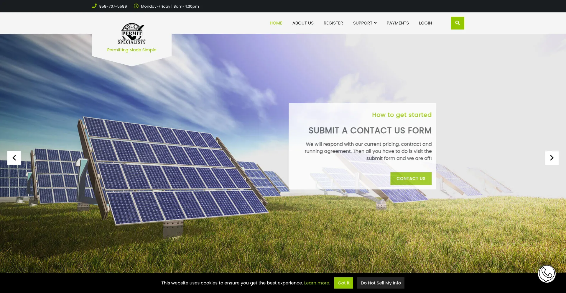 solarpermitspecialists.com 使用 Bootstrap,这是一个广泛采用的开源响应式网页开发框架。Bootstrap 通过标准化组件和样式实现移动友好界面的高效创建。