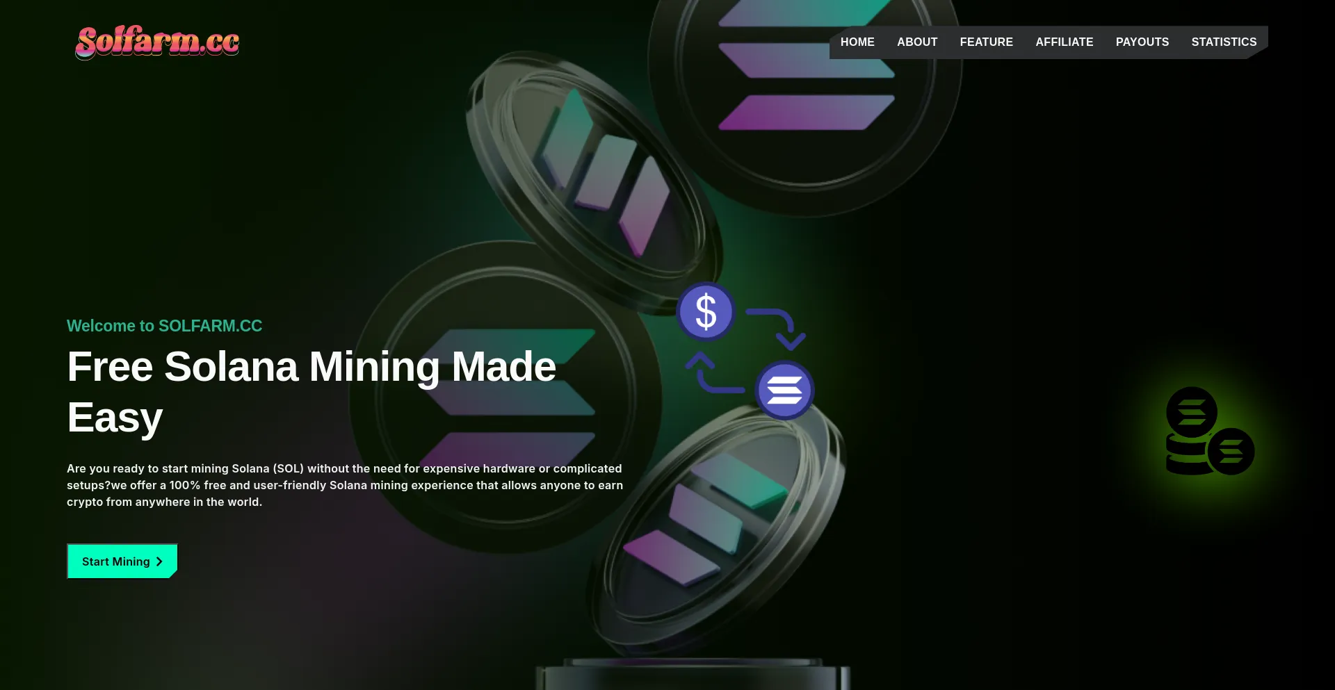 网站 solfarm.cc 可能提供云挖矿服务或加密货币挖矿投资。一些平台提供合法的挖矿租赁服务,而其他平台可能使用虚假的挖矿仪表板来显示无法提取的虚拟收益。