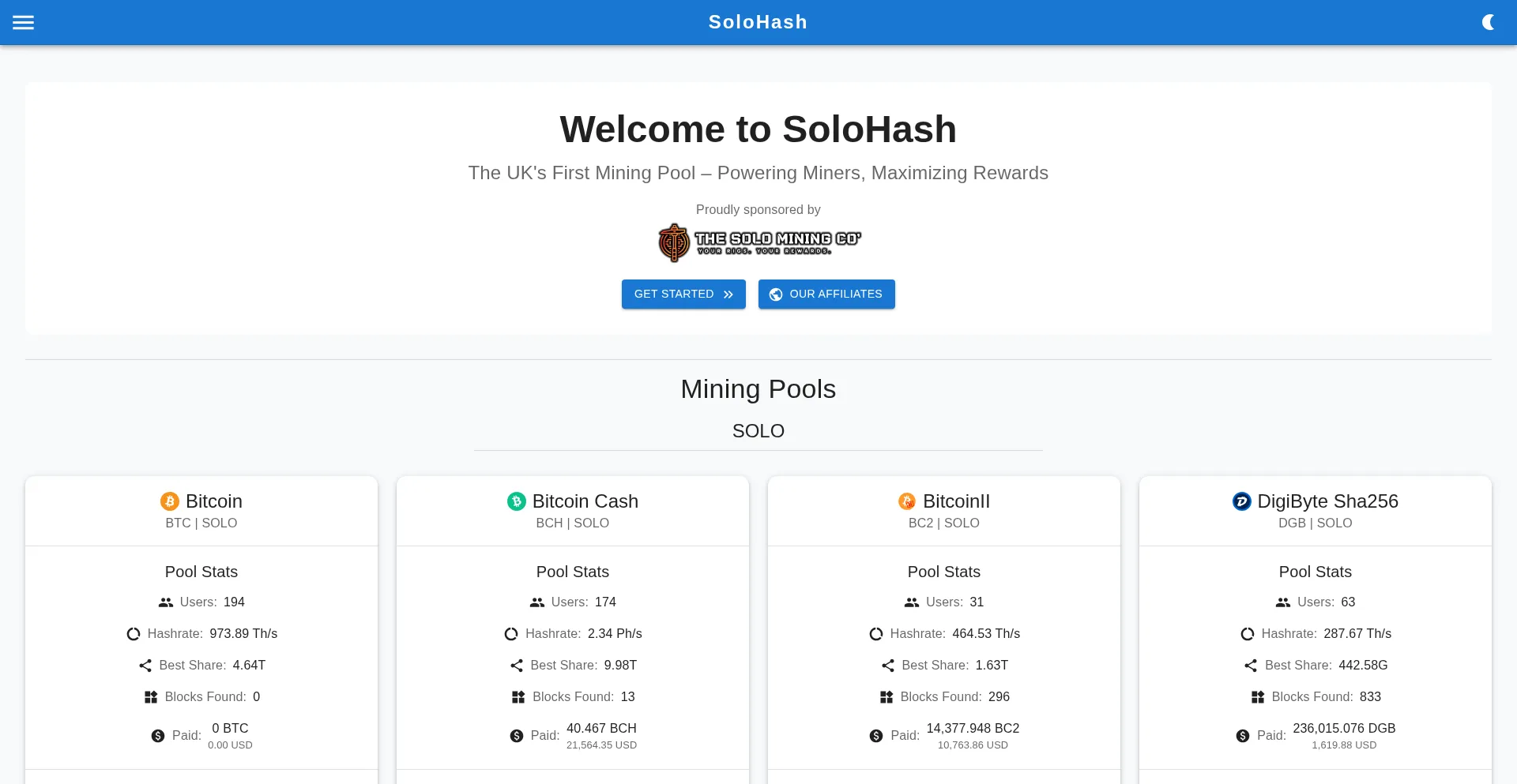 SoloHash is the first UK-based mining pool for Bitcoin, Bitcoin Cash, BitcoinII & DigiByte, giving miners full control and 100% block rewards with just a 0.5% fee. No shared rew...