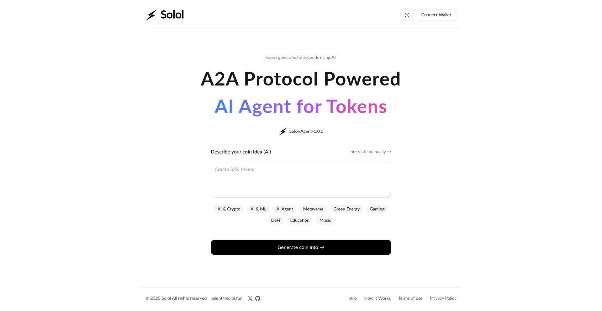 Solol is an AI Agent for multi-chain tokens, designed based on the A2A protocol. Describe your token. Launches it instantly. Fully autonomous.