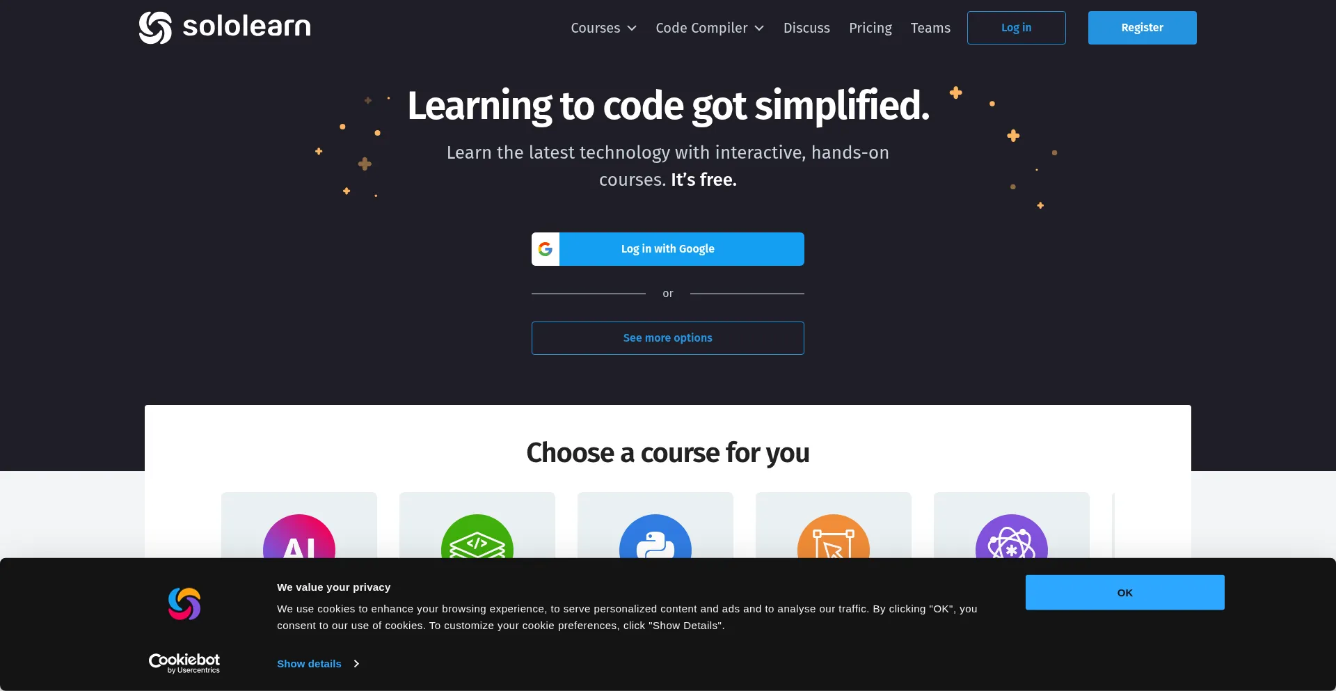 该网站实现符合GDPR或CCPA等隐私法规的cookie同意机制。这表明 sololearn.com 遵守数据保护标准并为用户提供对个人数据收集实践的控制。
