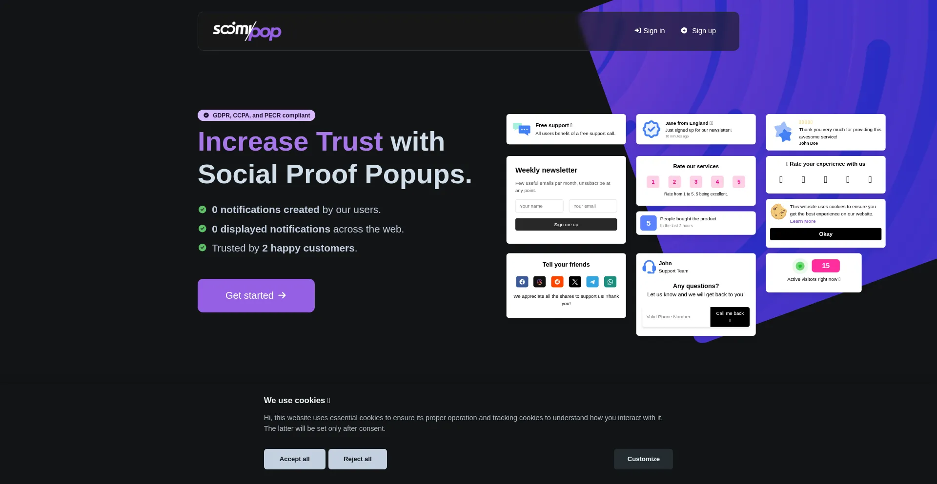 该网站实现符合GDPR或CCPA等隐私法规的cookie同意机制。这表明 soomipop.com 遵守数据保护标准并为用户提供对个人数据收集实践的控制。