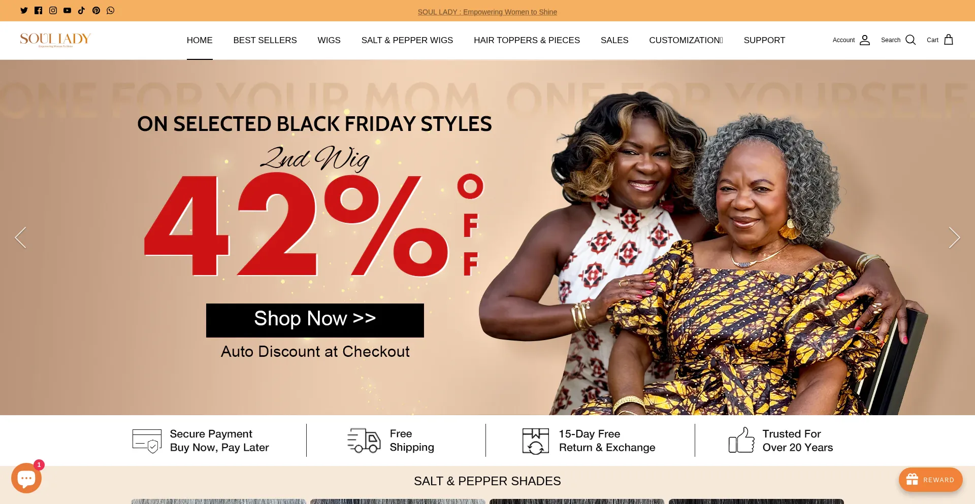 网站上存在社交媒体链接表明 soulladywigs.com 在社交媒体上维护官方账户,这是可信度和参与度的积极信号。