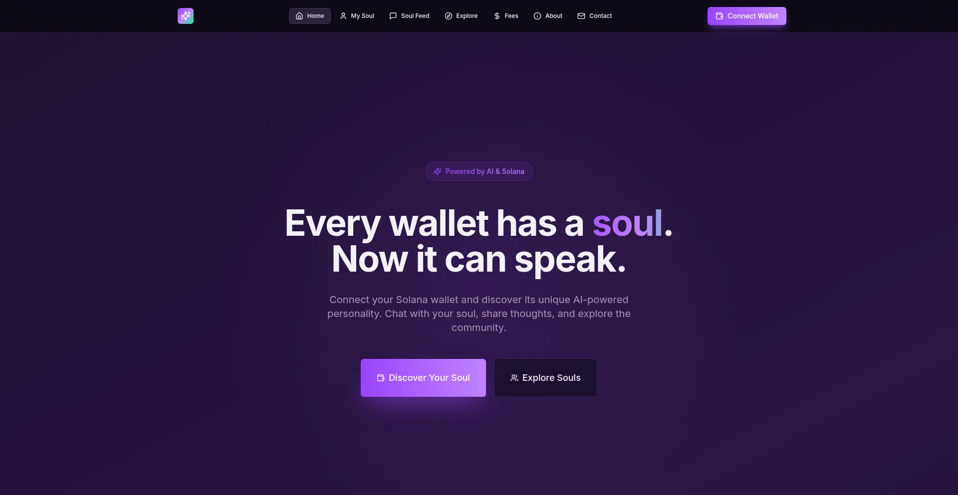 Connect your Solana wallet and discover its AI-powered soul personality. Chat with your soul, share thoughts, and explore the community.
