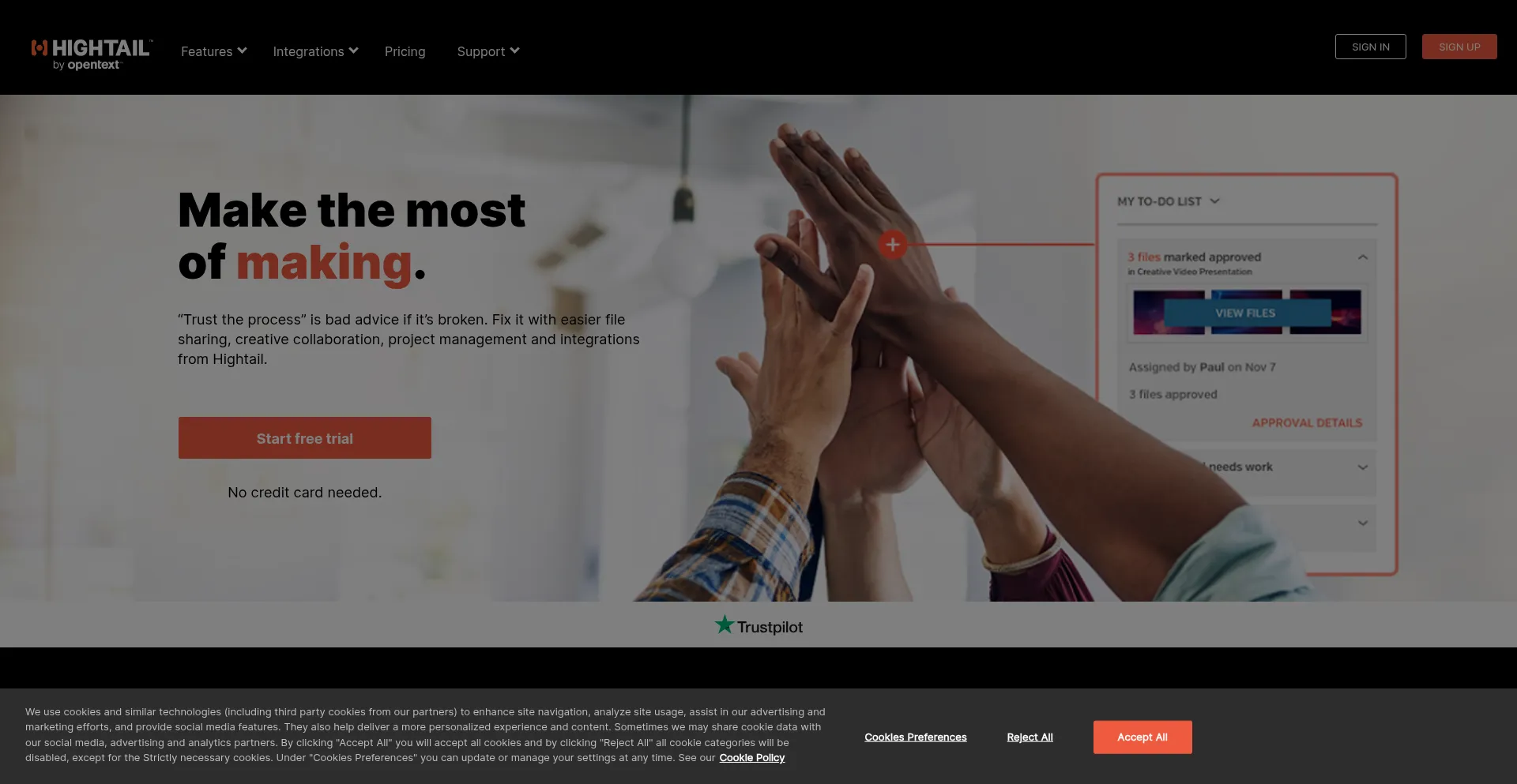 该网站实现符合GDPR或CCPA等隐私法规的cookie同意机制。这表明 spaces.hightail.com 遵守数据保护标准并为用户提供对个人数据收集实践的控制。