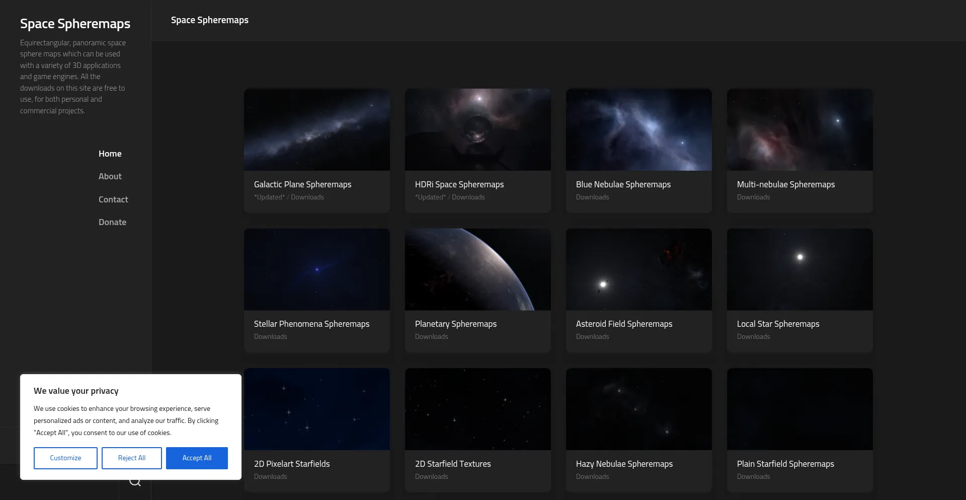 Equirectangular, panoramic space sphere maps which can be used with a variety of 3D applications and game engines. All the downloads on this site are free to use, for both perso...