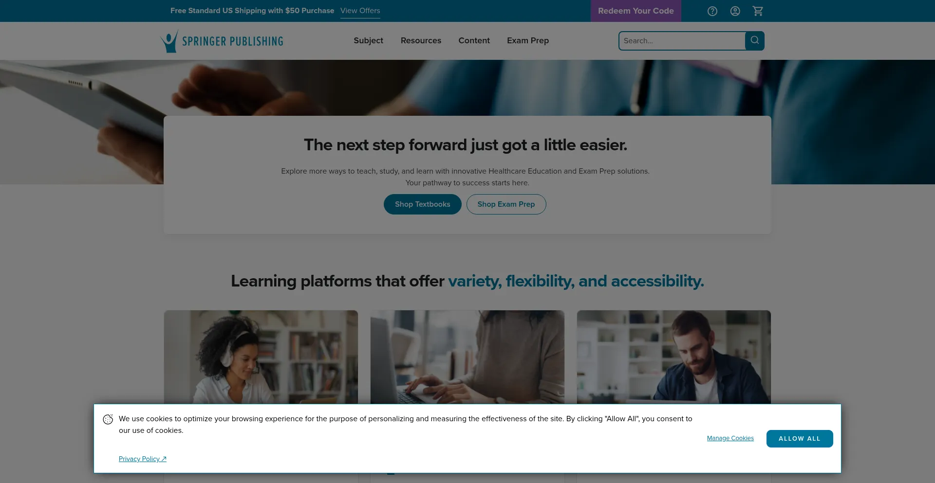 该网站实现符合GDPR或CCPA等隐私法规的cookie同意机制。这表明 springerpub.com 遵守数据保护标准并为用户提供对个人数据收集实践的控制。