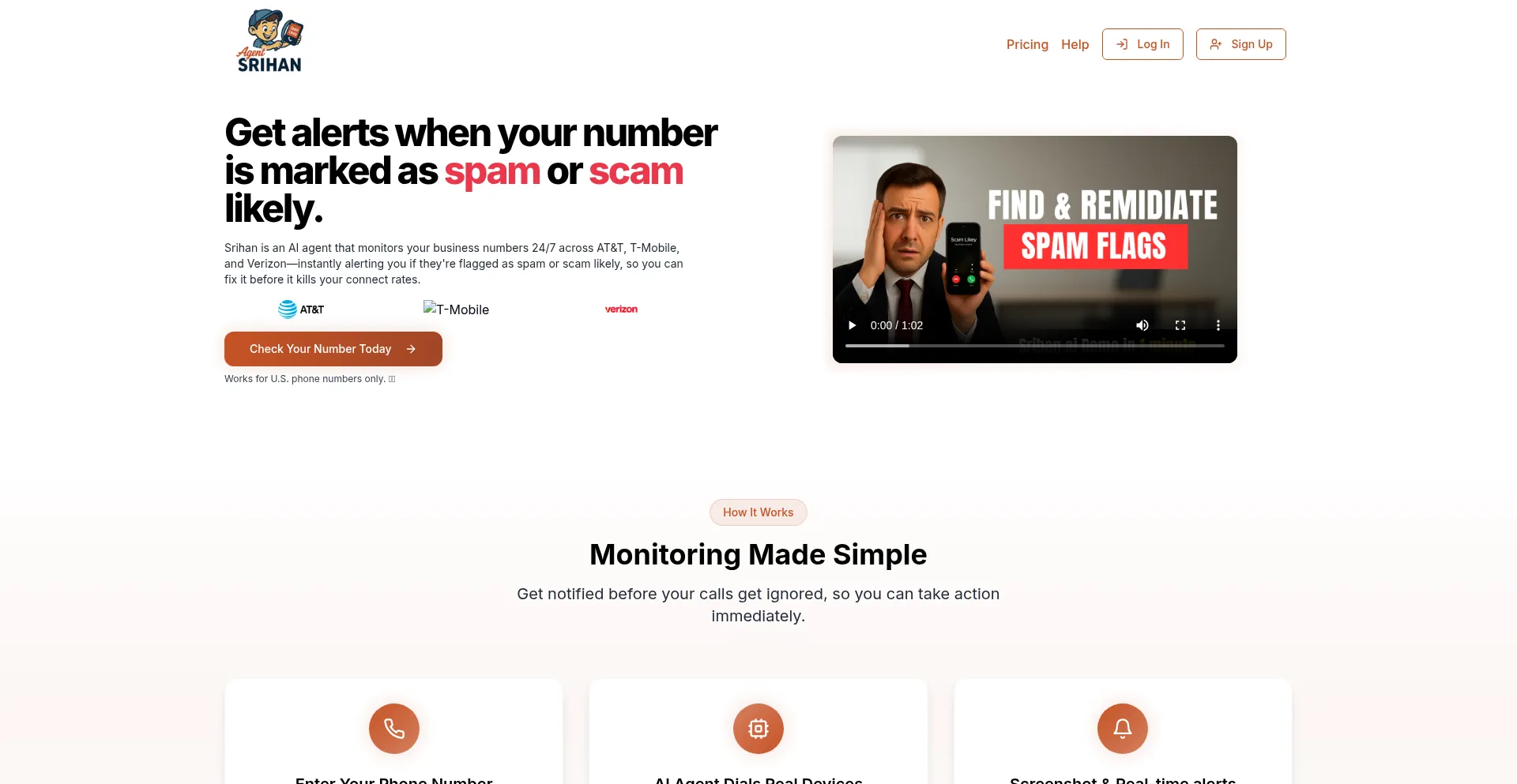 Built by a 10-year-old. Srihan.ai monitors your business numbers and alerts you the moment they're marked as Spam or Scam Likely by major carriers.