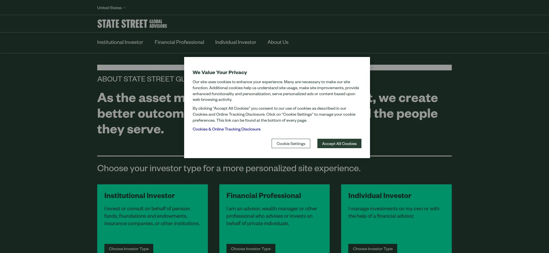 该网站实现符合GDPR或CCPA等隐私法规的cookie同意机制。这表明 ssga.com 遵守数据保护标准并为用户提供对个人数据收集实践的控制。