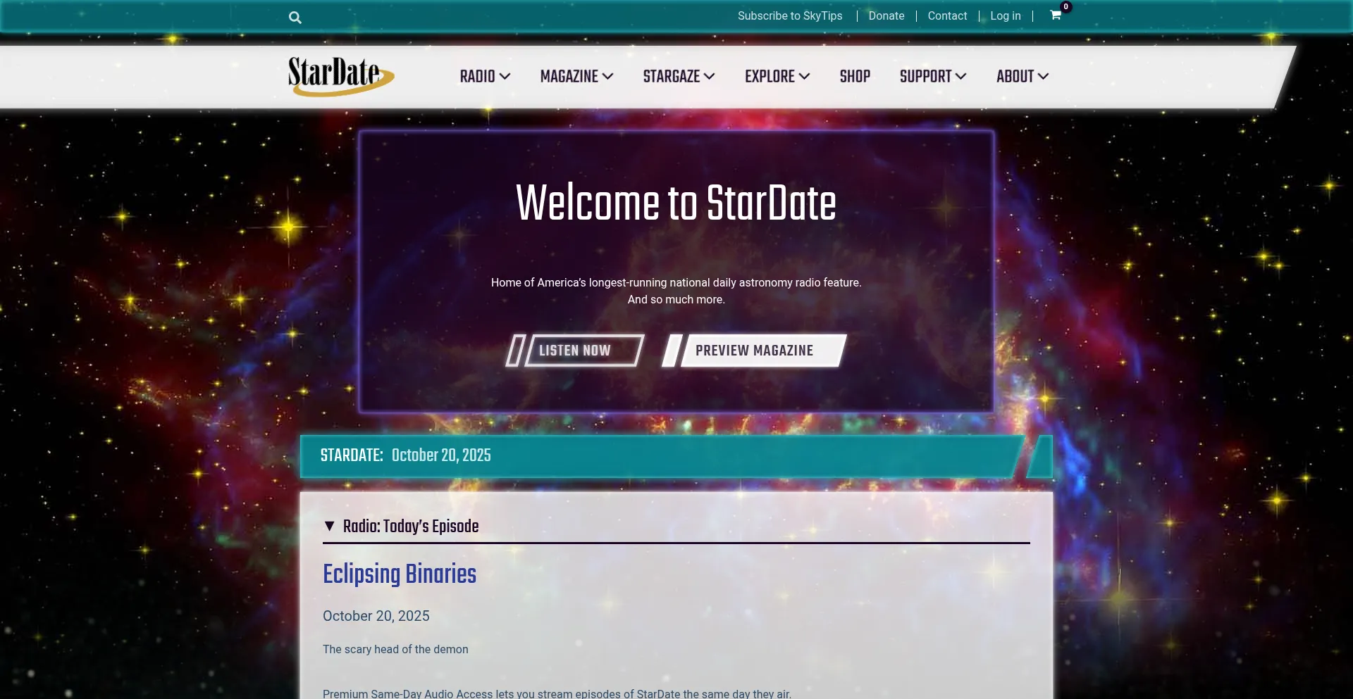 Welcome to StarDate Home of America’s longest-running national daily astronomy radio feature.And so much more. Listen Now Preview Magazine Stardate:
