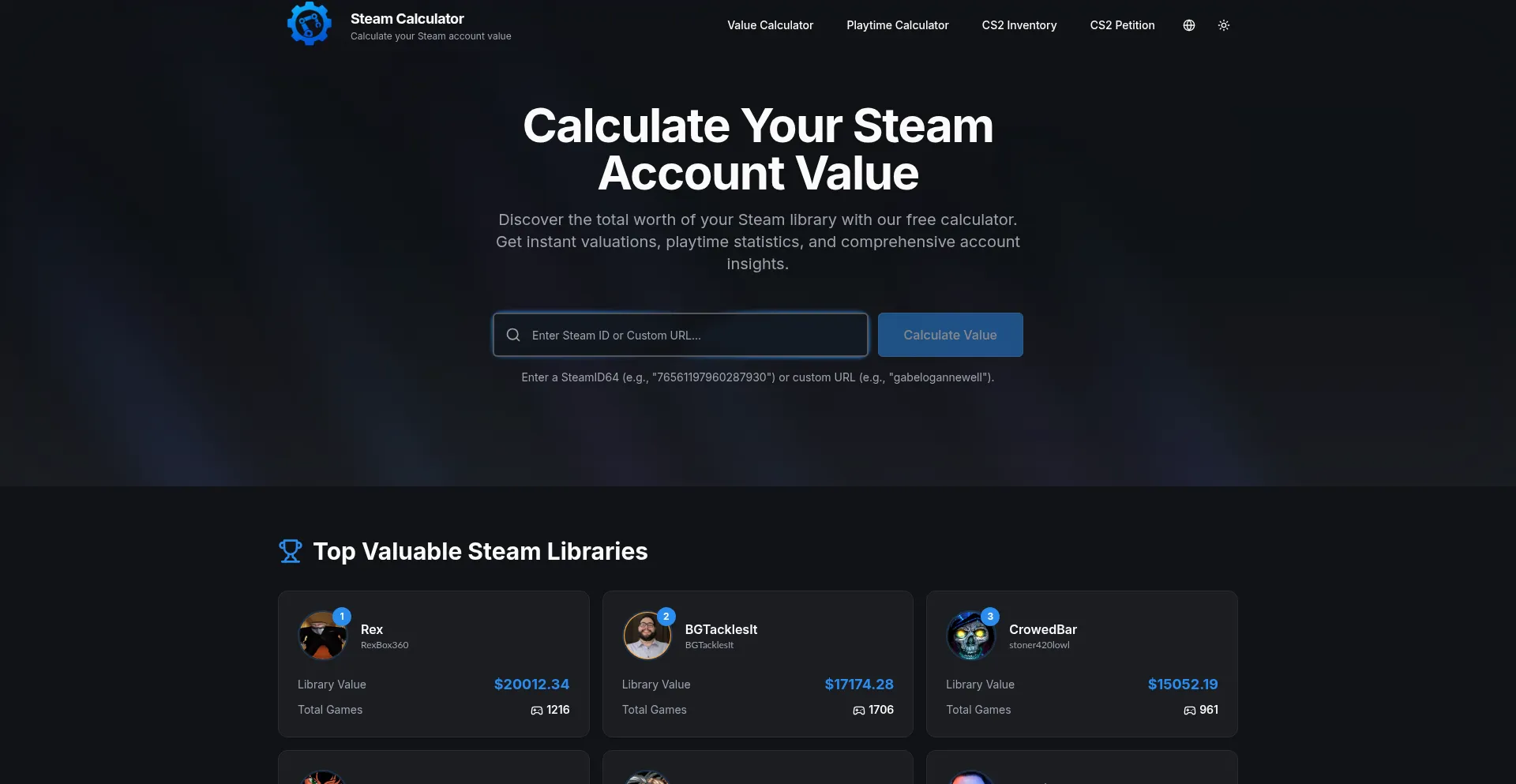 Calculate your Steam account value instantly. Free Steam library worth calculator showing game values, total playtime, and comprehensive statistics. Check how much your Steam ac...