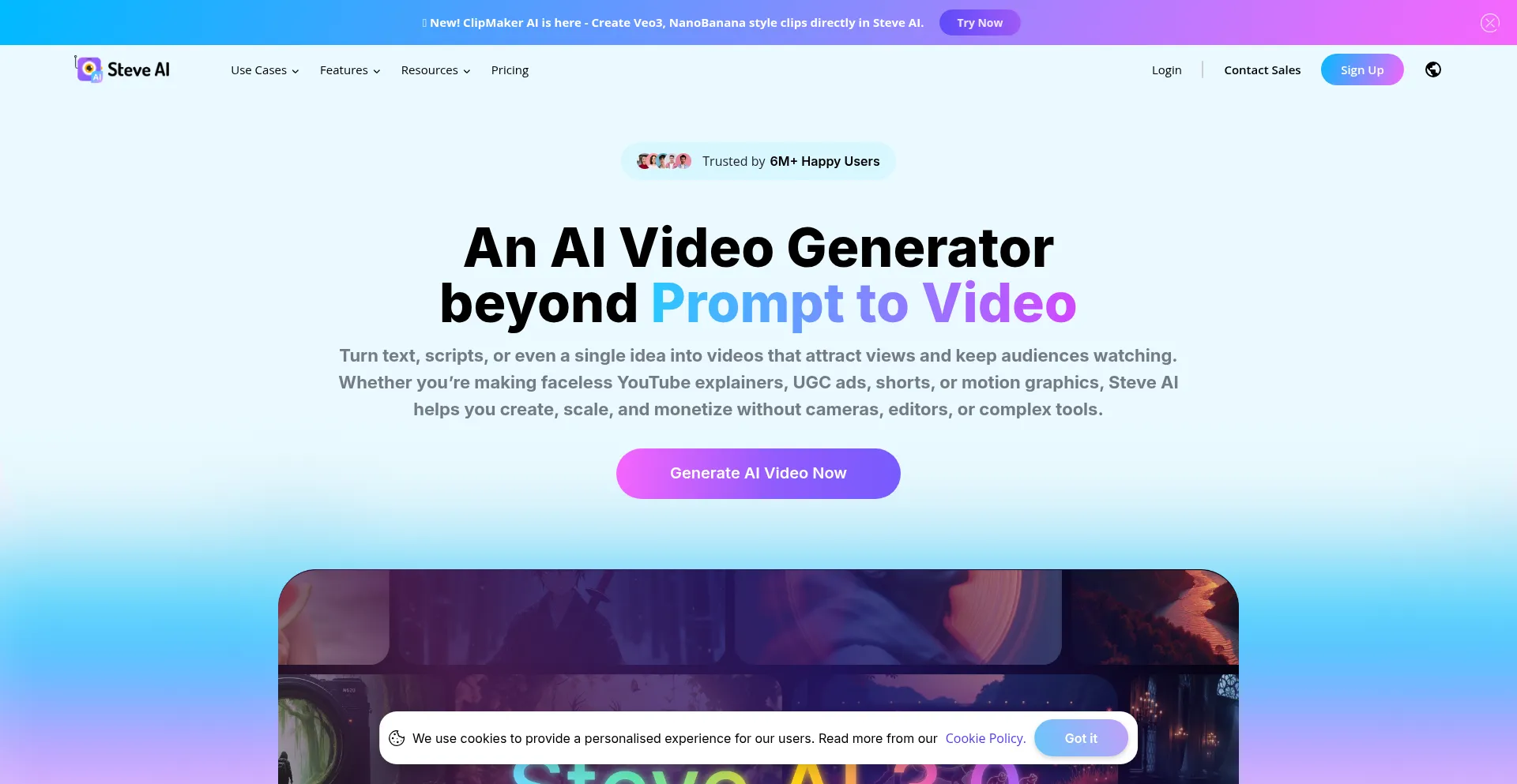 该网站实现符合GDPR或CCPA等隐私法规的cookie同意机制。这表明 steve.ai 遵守数据保护标准并为用户提供对个人数据收集实践的控制。