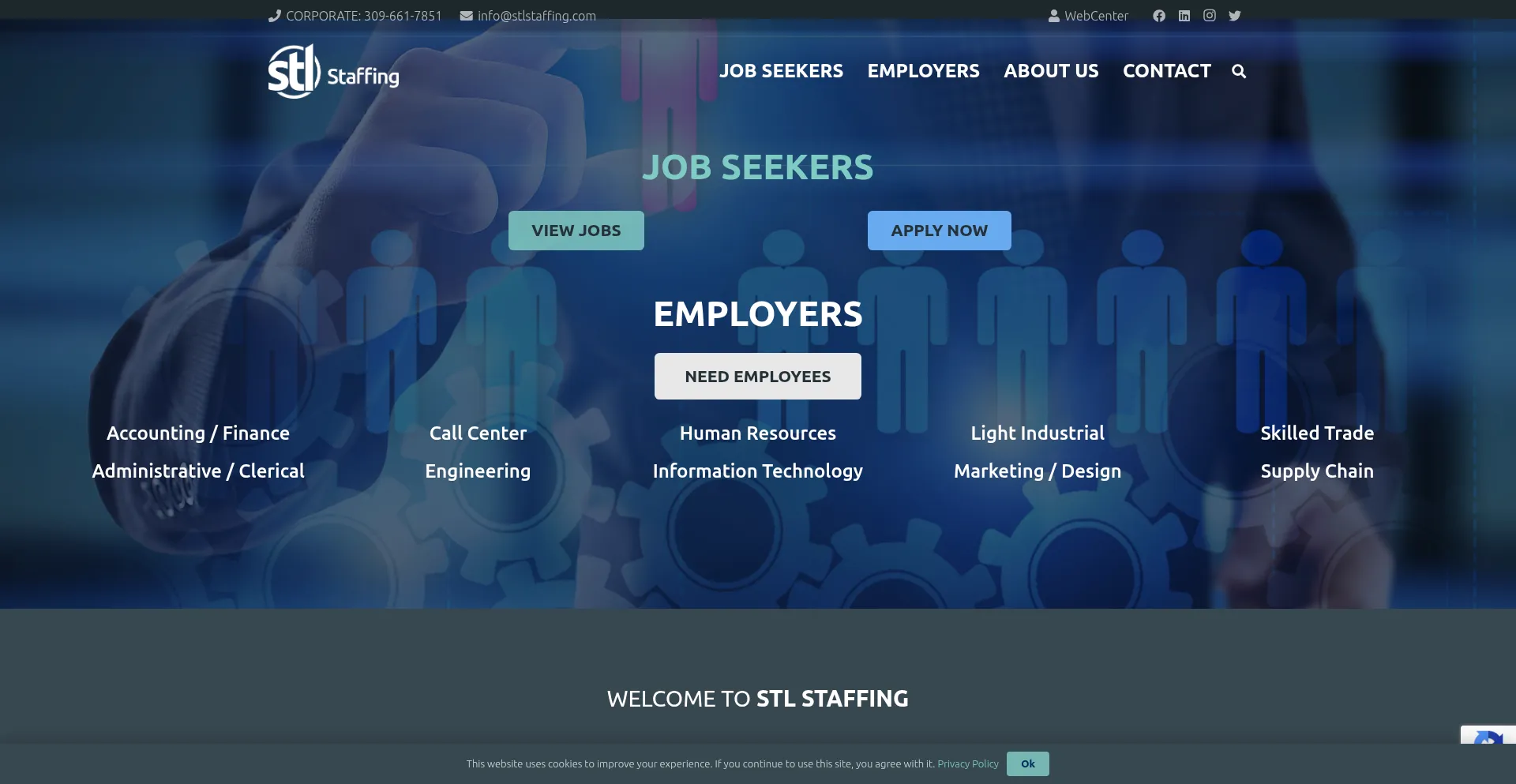 该网站实现数据收集表单,请求个人信息,包括姓名、电子邮件地址、电话号码或其他敏感详细信息。用户应验证 stlstaffing.com 的合法性并在提交个人数据前查看隐私政策。