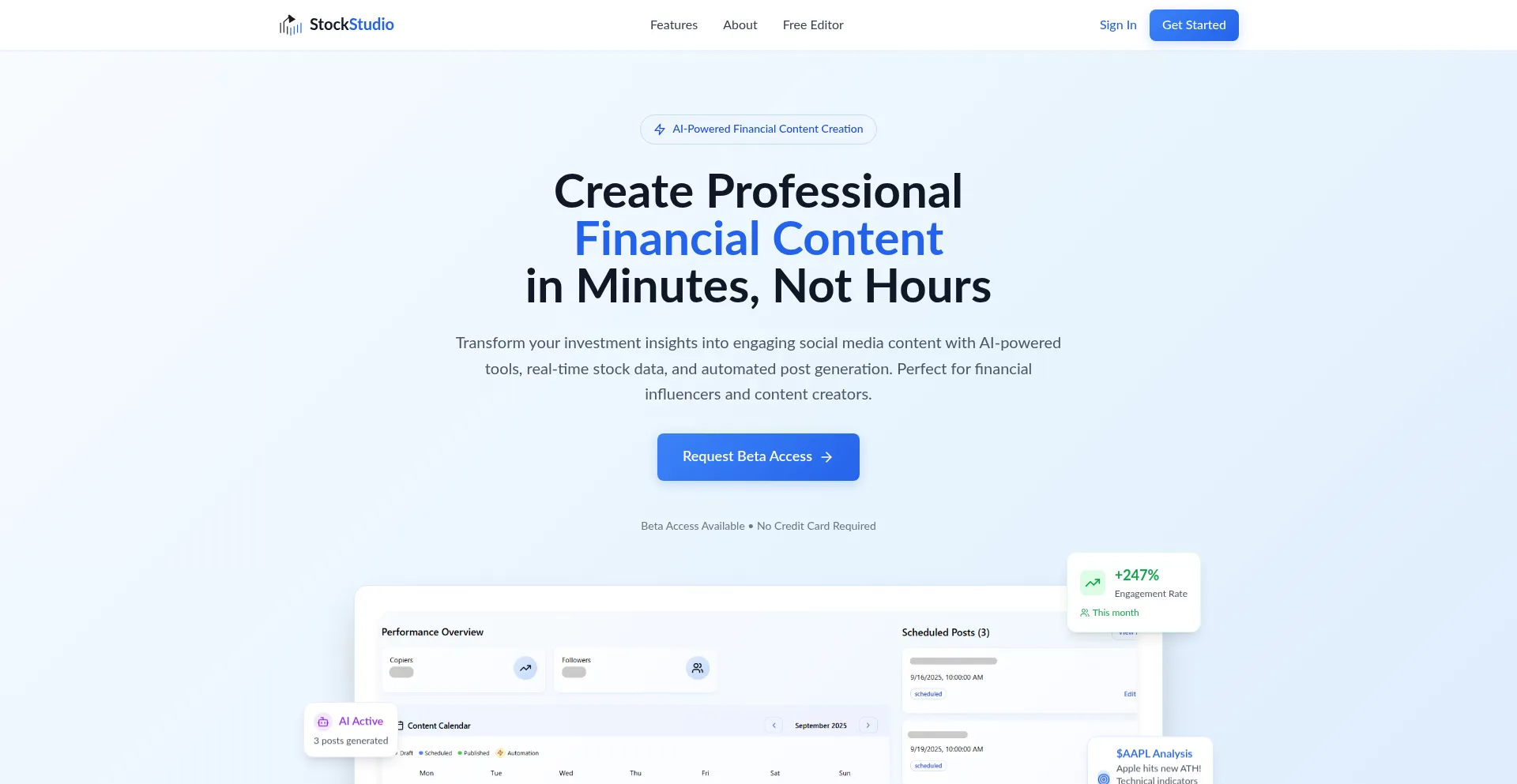 Create engaging financial content with AI-powered tools, real-time stock data, and automated post generation. Perfect for financial influencers and content creators.