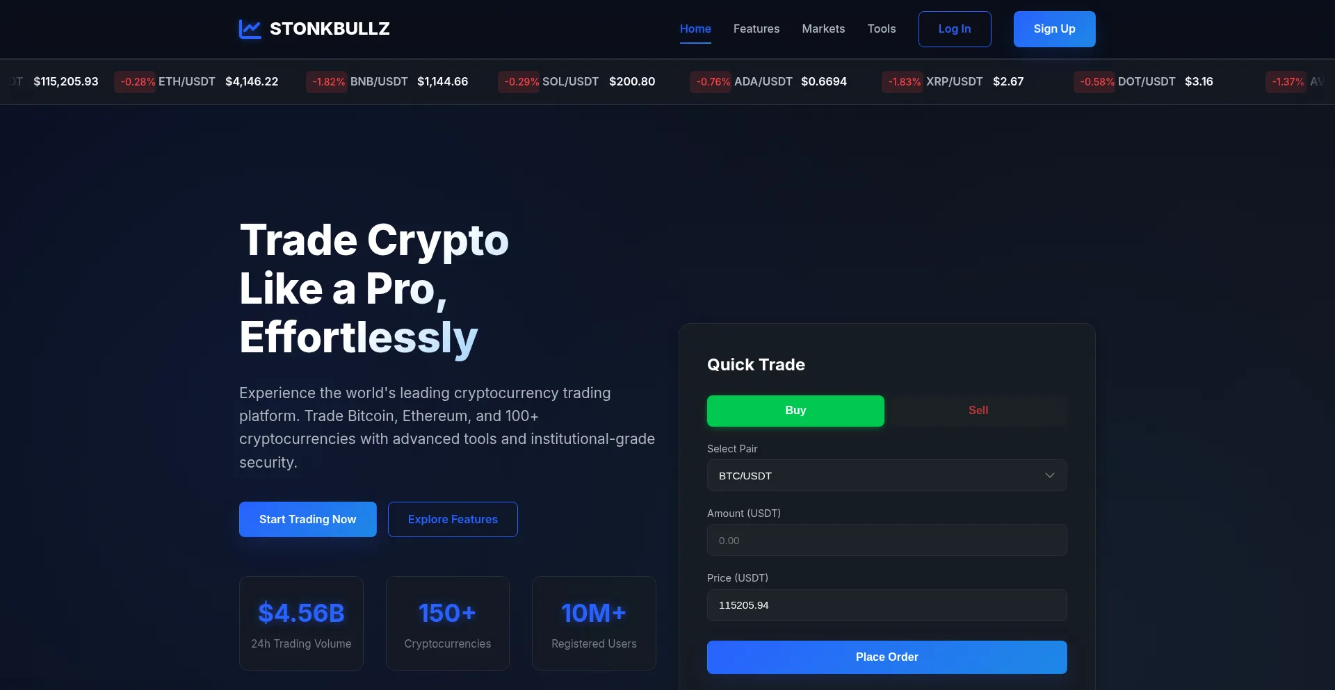 Trade Bitcoin, Ethereum, and 100+ cryptocurrencies on STONKBULLZ. Professional trading platform with advanced tools and 24/7 support.