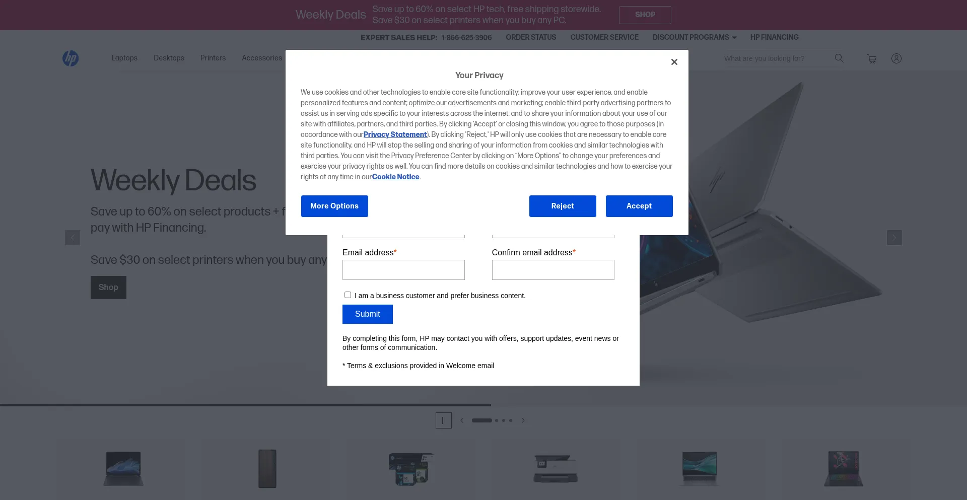 该网站实现符合GDPR或CCPA等隐私法规的cookie同意机制。这表明 store.hp.com 遵守数据保护标准并为用户提供对个人数据收集实践的控制。