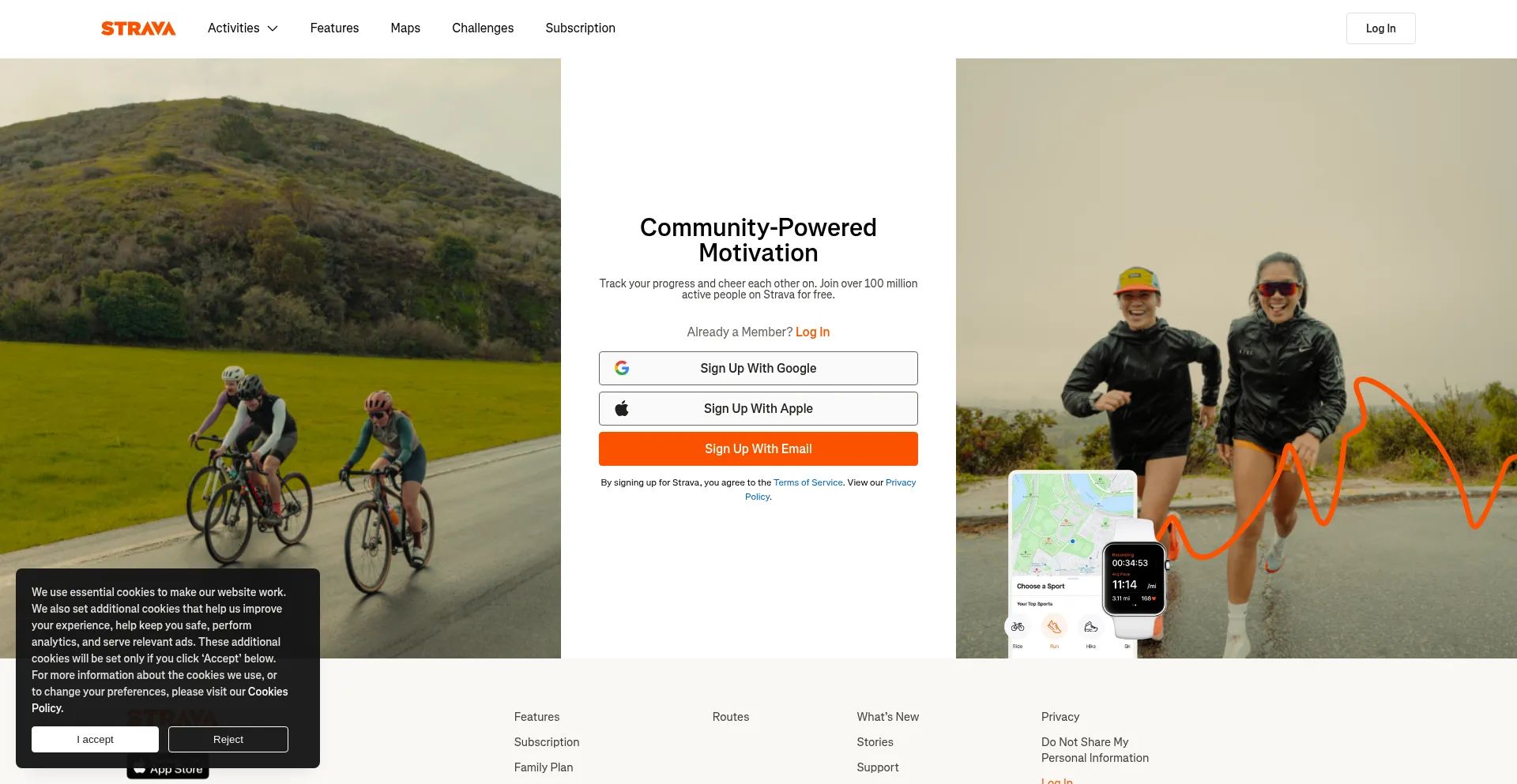该网站实现符合GDPR或CCPA等隐私法规的cookie同意机制。这表明 strava.com 遵守数据保护标准并为用户提供对个人数据收集实践的控制。