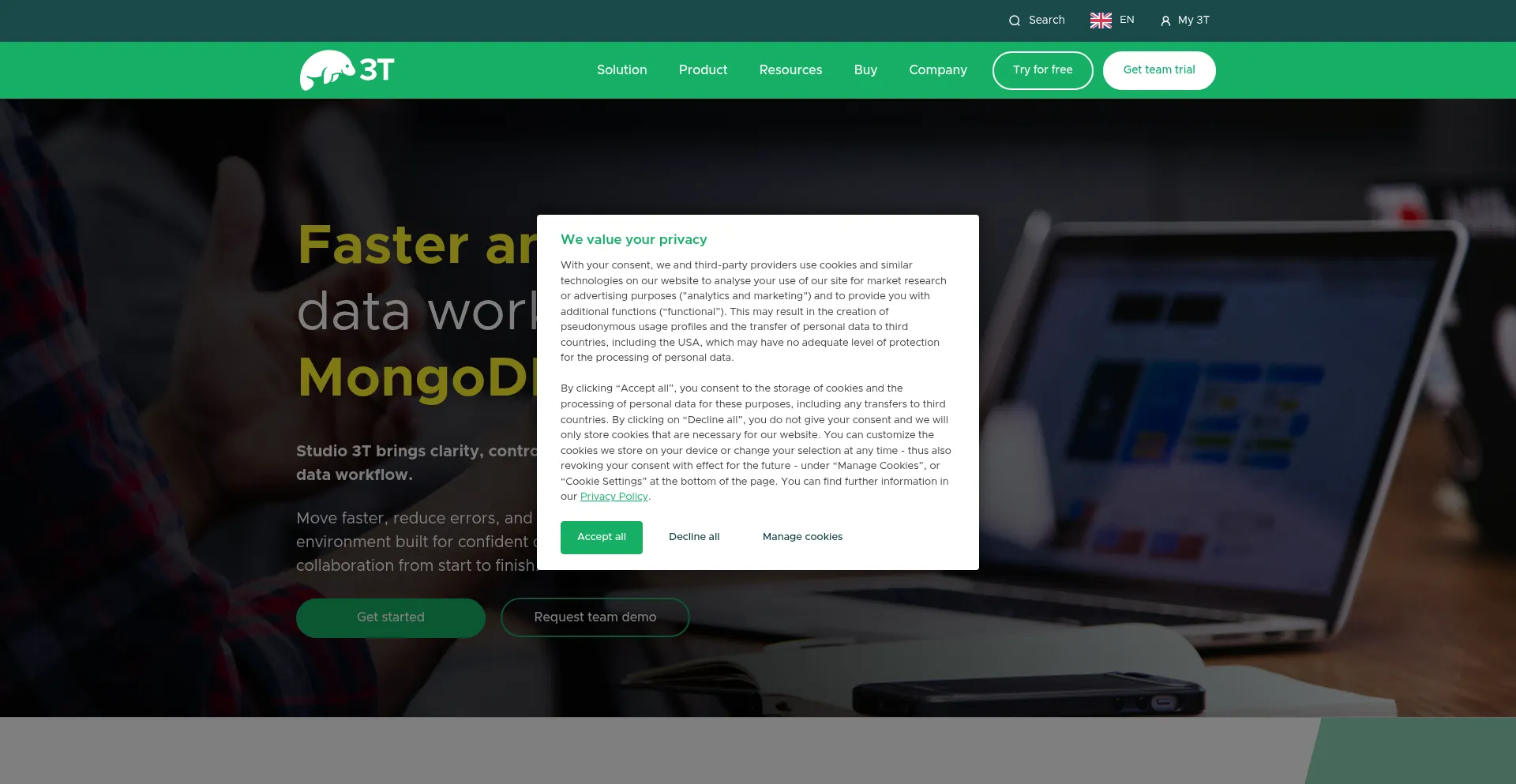 该网站实现符合GDPR或CCPA等隐私法规的cookie同意机制。这表明 studio3t.com 遵守数据保护标准并为用户提供对个人数据收集实践的控制。