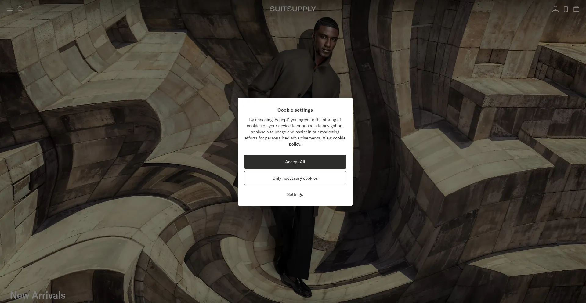 该网站实现符合GDPR或CCPA等隐私法规的cookie同意机制。这表明 suitsupply.com 遵守数据保护标准并为用户提供对个人数据收集实践的控制。