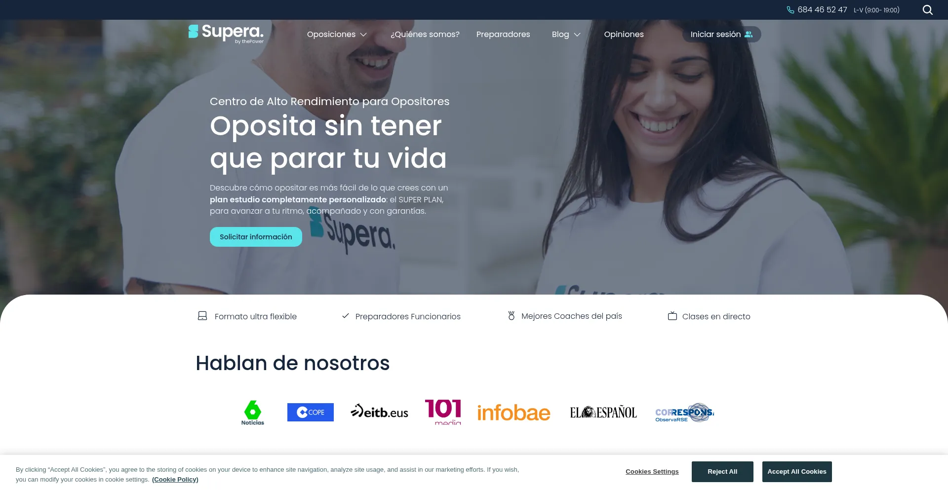该网站实现符合GDPR或CCPA等隐私法规的cookie同意机制。这表明 superaoposiciones.es 遵守数据保护标准并为用户提供对个人数据收集实践的控制。
