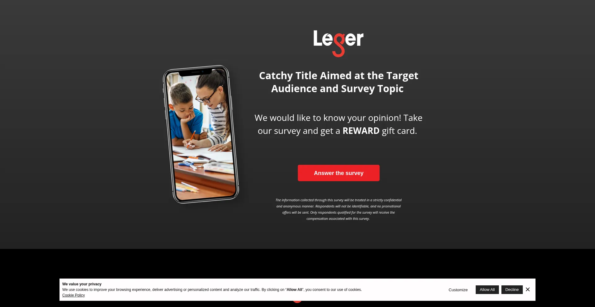 该网站实现符合GDPR或CCPA等隐私法规的cookie同意机制。这表明 surveys.legeropinion.com 遵守数据保护标准并为用户提供对个人数据收集实践的控制。