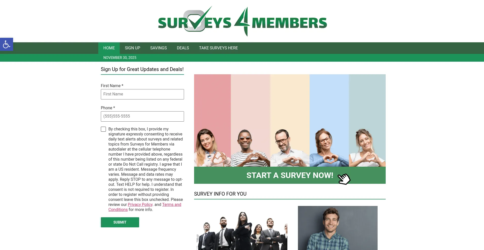 该网站实现数据收集表单,请求个人信息,包括姓名、电子邮件地址、电话号码或其他敏感详细信息。用户应验证 surveys4mem.ms 的合法性并在提交个人数据前查看隐私政策。