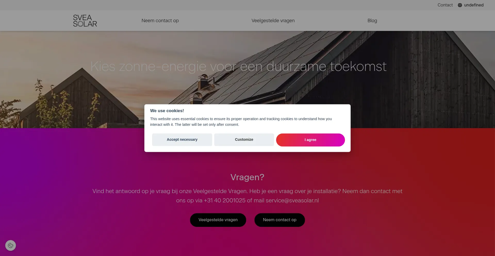 该网站实现符合GDPR或CCPA等隐私法规的cookie同意机制。这表明 sveasolar.nl 遵守数据保护标准并为用户提供对个人数据收集实践的控制。