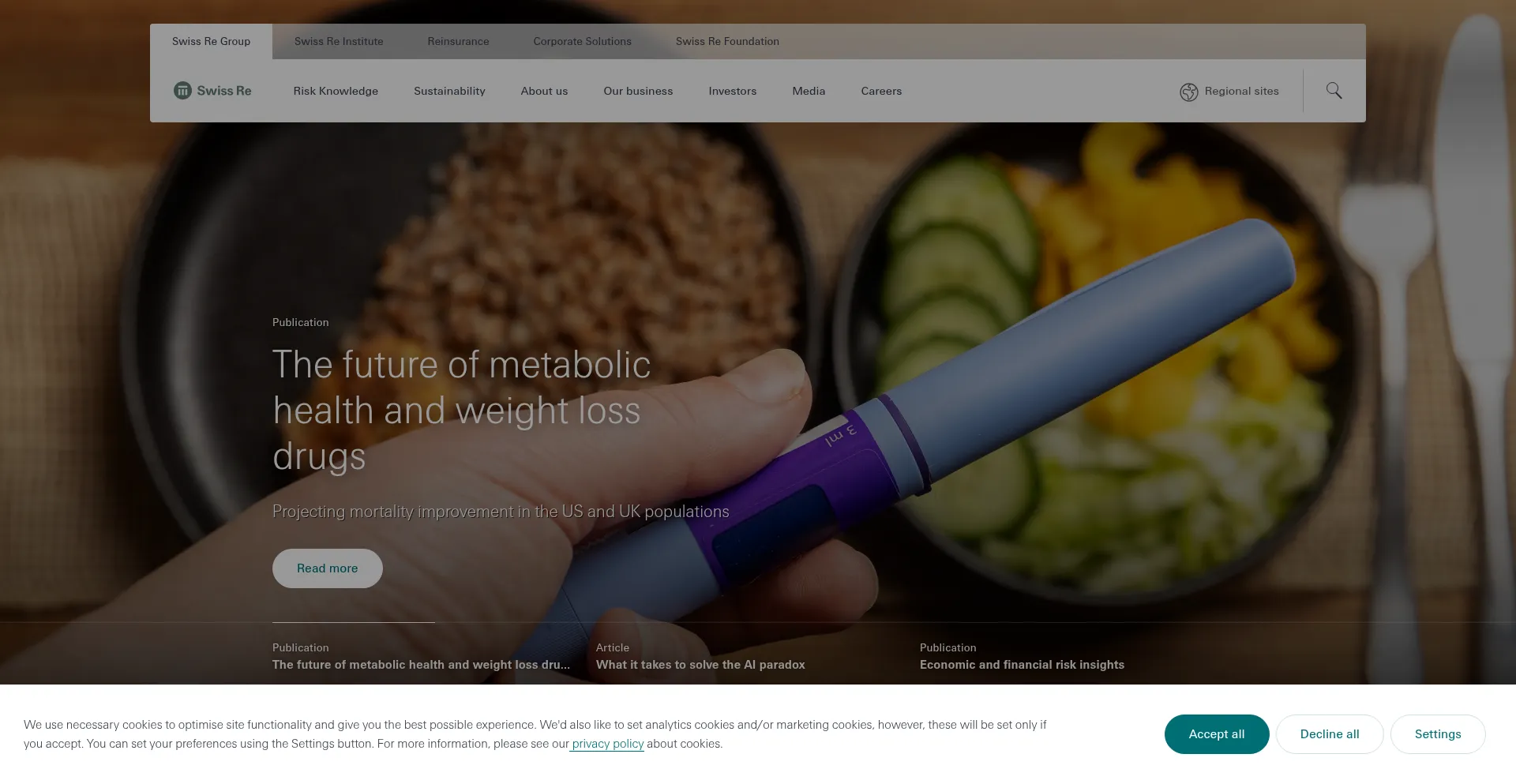 该网站实现符合GDPR或CCPA等隐私法规的cookie同意机制。这表明 swissre.com 遵守数据保护标准并为用户提供对个人数据收集实践的控制。