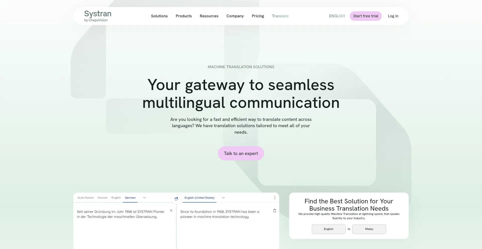 Translate text, documents and much more in 55+ languages with SYSTRAN fully secured professional translation solutions. API & CAT Tool integration