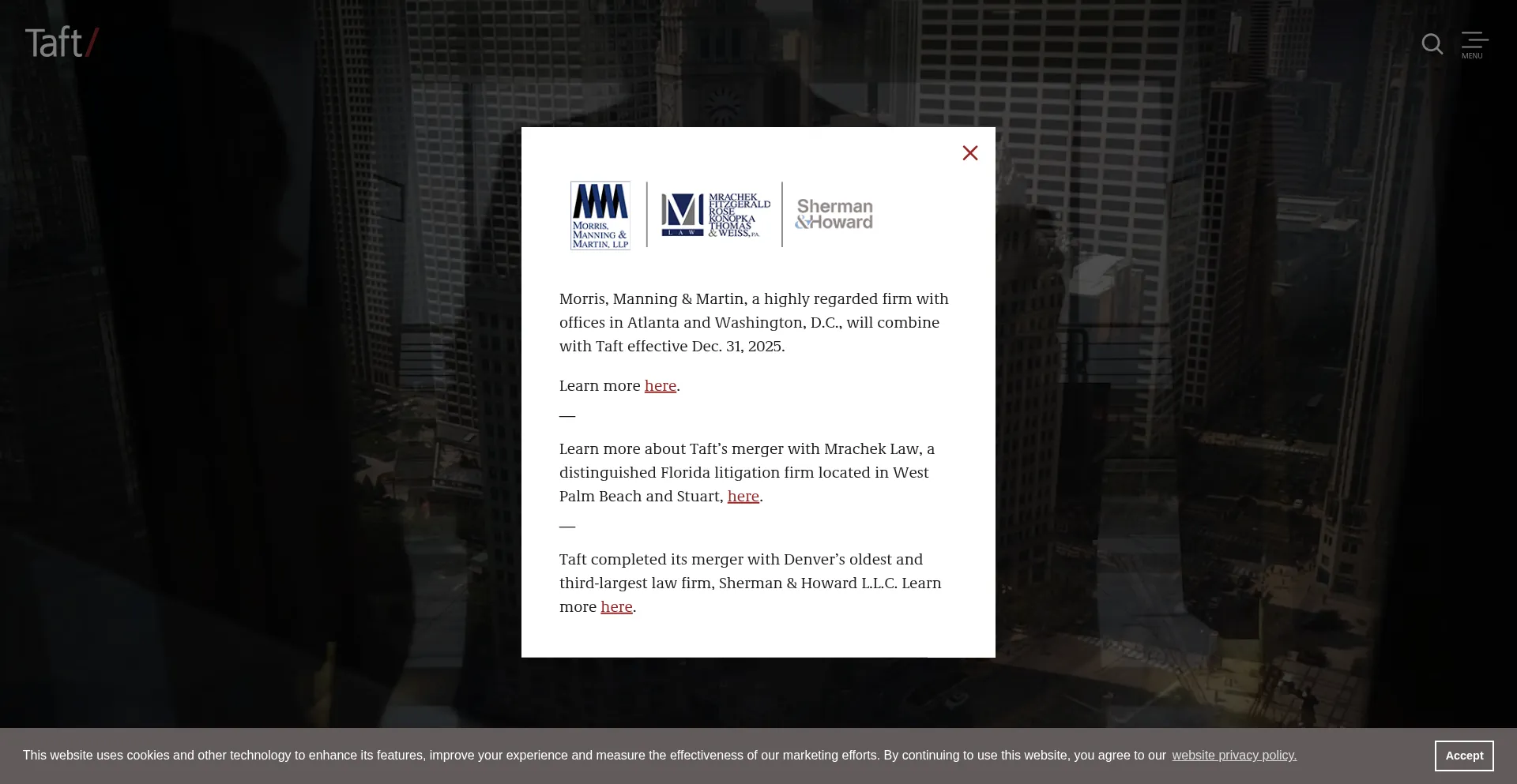 该网站实现符合GDPR或CCPA等隐私法规的cookie同意机制。这表明 taftlaw.com 遵守数据保护标准并为用户提供对个人数据收集实践的控制。