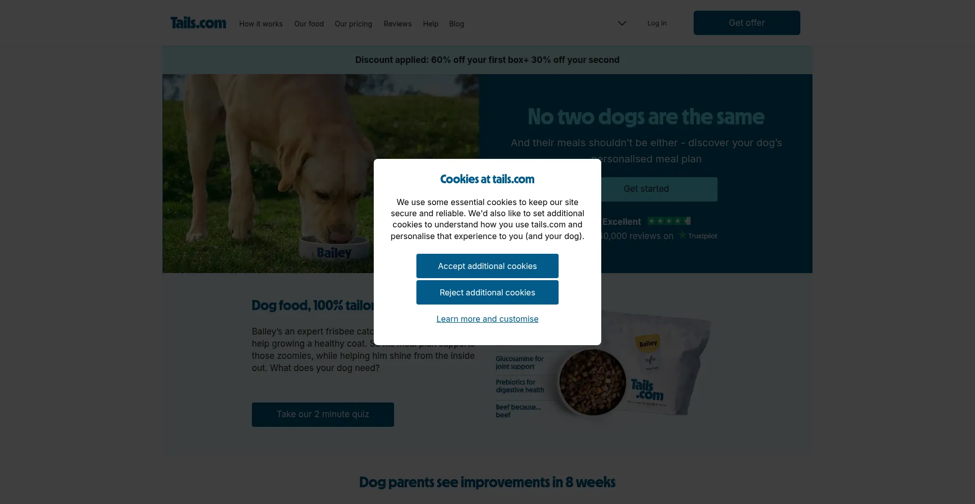 该网站实现符合GDPR或CCPA等隐私法规的cookie同意机制。这表明 tails.com 遵守数据保护标准并为用户提供对个人数据收集实践的控制。