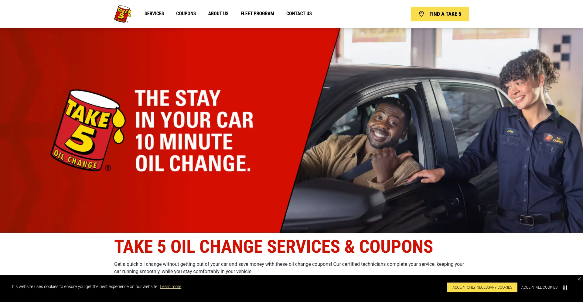 该网站实现符合GDPR或CCPA等隐私法规的cookie同意机制。这表明 take5oilchange.com 遵守数据保护标准并为用户提供对个人数据收集实践的控制。