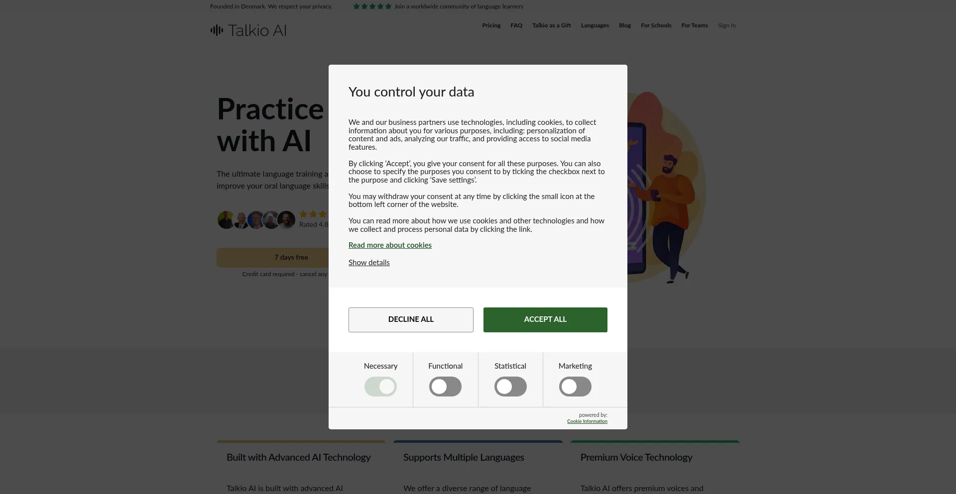 该网站实现符合GDPR或CCPA等隐私法规的cookie同意机制。这表明 talkio.ai 遵守数据保护标准并为用户提供对个人数据收集实践的控制。