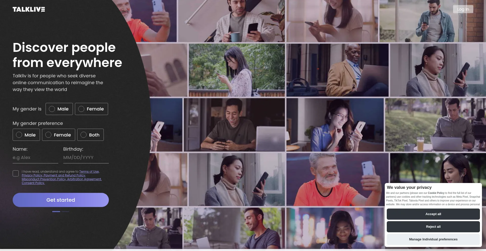该网站实现数据收集表单,请求个人信息,包括姓名、电子邮件地址、电话号码或其他敏感详细信息。用户应验证 talkliv.com 的合法性并在提交个人数据前查看隐私政策。