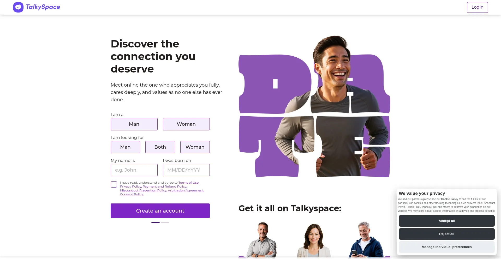 该网站实现数据收集表单,请求个人信息,包括姓名、电子邮件地址、电话号码或其他敏感详细信息。用户应验证 talkyspace.com 的合法性并在提交个人数据前查看隐私政策。