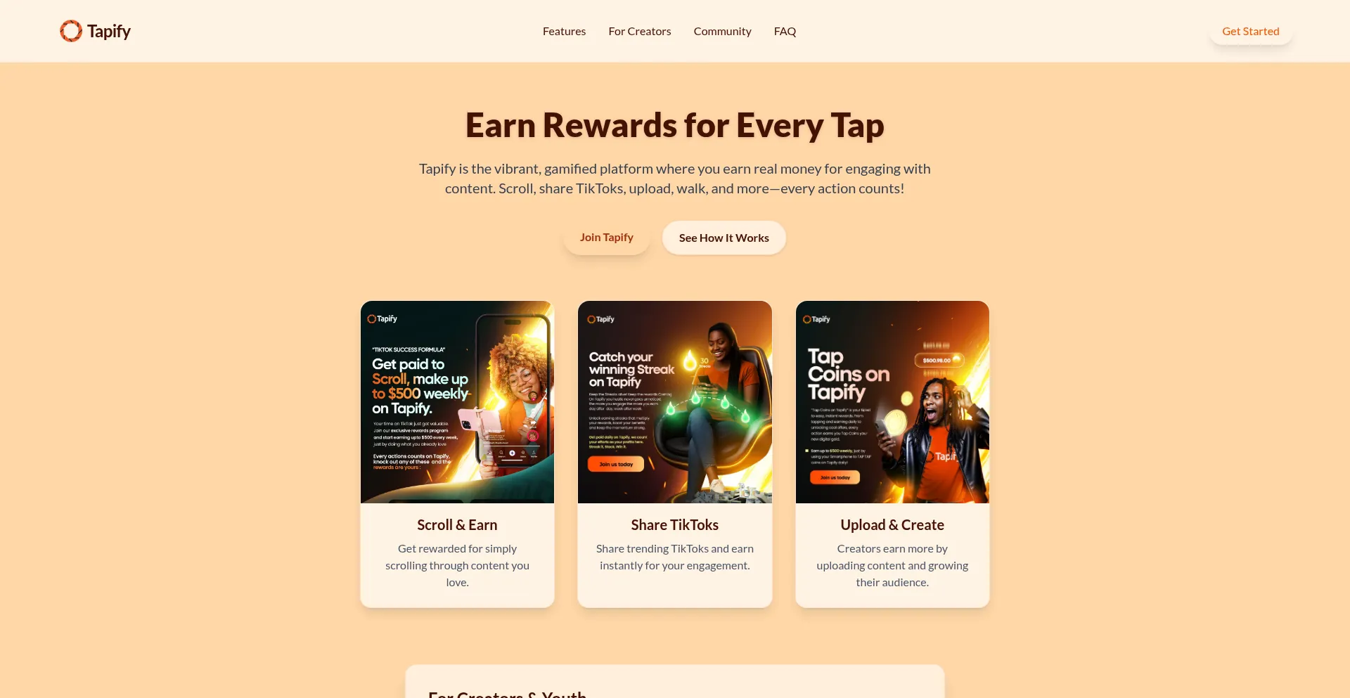 Tapify is a vibrant, gamified platform where youth and creators earn money by engaging with content—scroll, share TikToks, upload, walk, and more. Join the next-gen reward-bas...