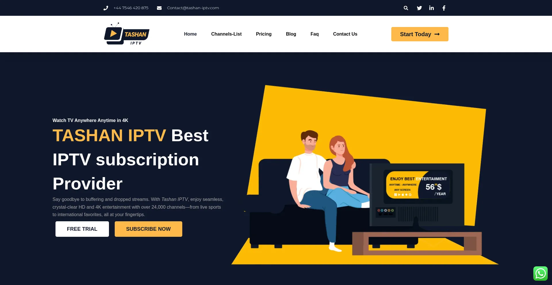Get Tashan IPTV, the best IPTV subscription for unlimited live TV, movies, and sports. Enjoy 24,000+ channels in HD & 4K with smooth, buffer-free streaming on all devices.