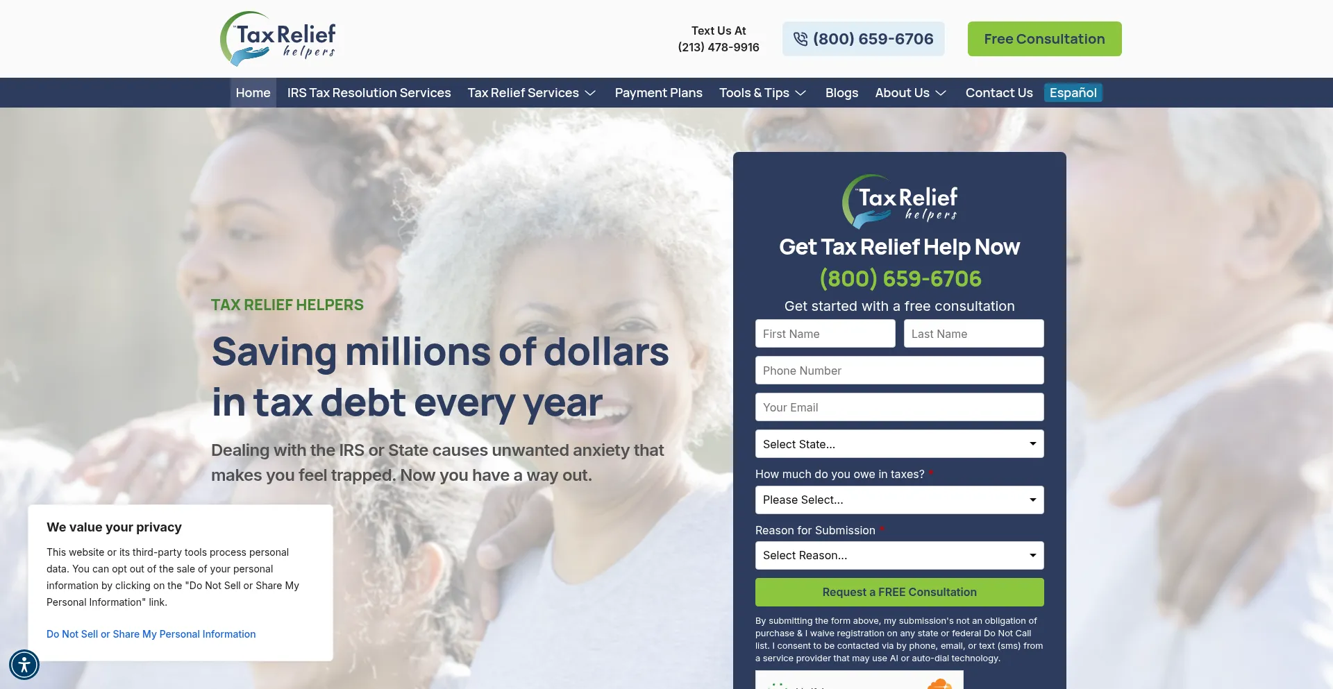 该网站实现数据收集表单,请求个人信息,包括姓名、电子邮件地址、电话号码或其他敏感详细信息。用户应验证 taxreliefhelpers.com 的合法性并在提交个人数据前查看隐私政策。