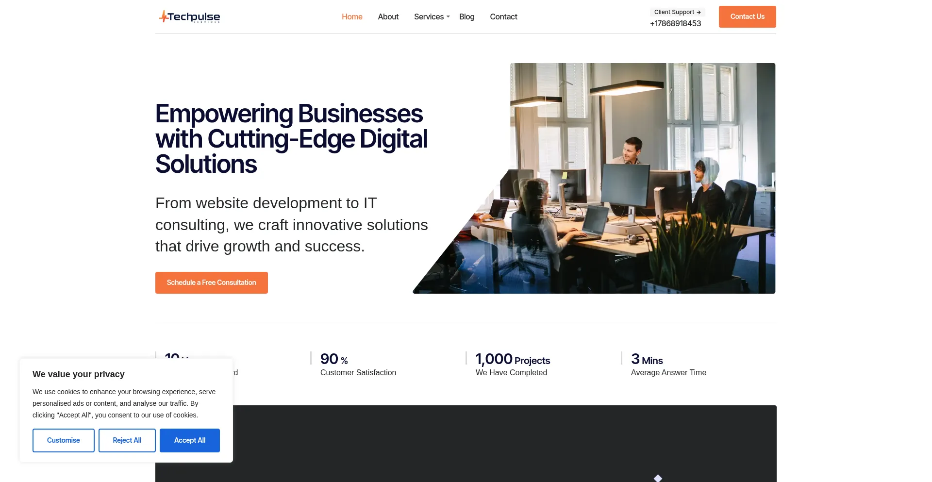 该网站实现符合GDPR或CCPA等隐私法规的cookie同意机制。这表明 techpulseservices.com 遵守数据保护标准并为用户提供对个人数据收集实践的控制。