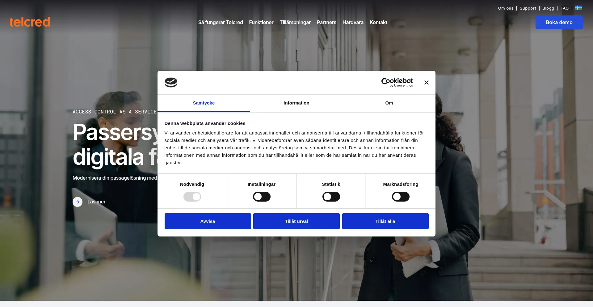 该网站实现符合GDPR或CCPA等隐私法规的cookie同意机制。这表明 telcred.se 遵守数据保护标准并为用户提供对个人数据收集实践的控制。