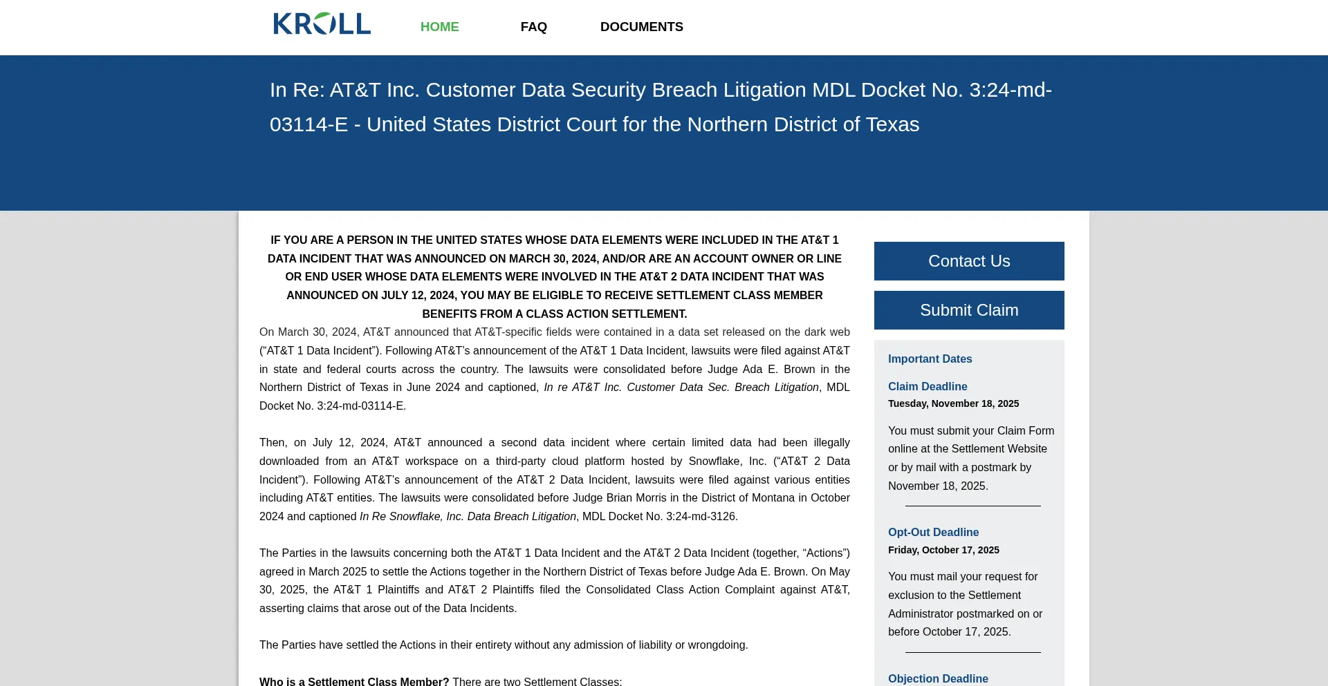 In Re: AT&T Inc. Customer Data Security Breach Litigation MDL Docket No. 3:24-md-03114-E - United States District Court for the Northern District of Texas